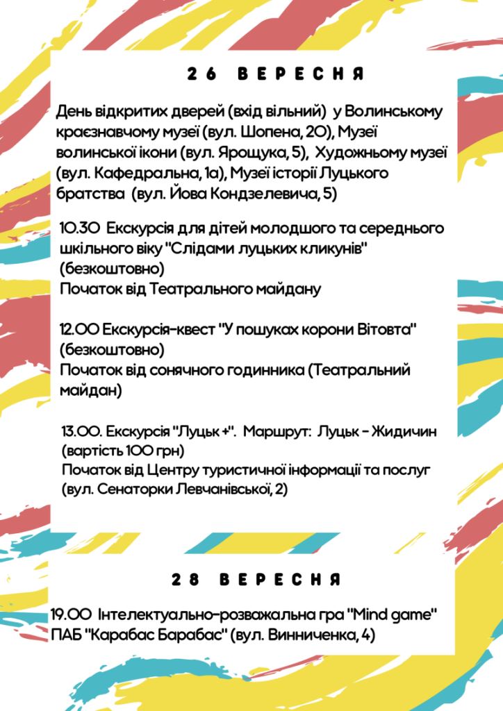 26 вересня, з нагоди свята Волинський краєзнавчий музей (вул. Шопена, 20) та його відділи: Музей волинської ікони (вул. Ярощука, 5), Художній музей (вул. Кафедральна, 1а), Музей історії Луцького братства (вул. Кондзелевича, 5) запрошує вас відвідати свої експозиції абсолютно безплатно, адже це день відкритих дверей (вхід вільний).
