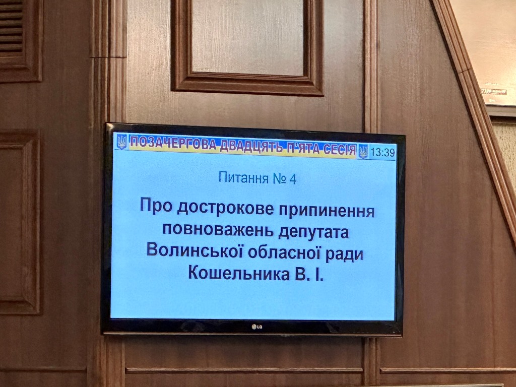 Більшістю голосів Волиньрада достроково припинила повноваження депутата обласної ради VIII скликання Валентина Кошельника. Таке рішення ухвалили, враховуючи його особисту заяву про складення депутатських повноважень, а також відповідно до рекомендацій постійної комісії з питань депутатської діяльності, місцевого самоврядування, захисту прав людини, законності, боротьби зі злочинністю та корупцією. Про це рішення обласної ради невідкладно поінформують Волинську обласну територіальну виборчу комісію.