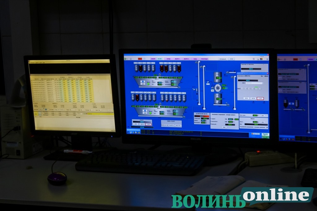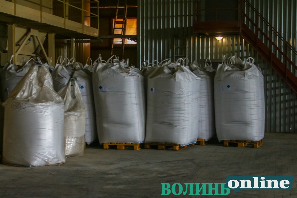 Директор комбікормового заводу Сергій Жигуров розповів, що у місяць роблять 10 тисяч тон кормів для власних потреб. Управляють усім процесом також за допомогою комп’ютерів. Тут є 40 бункерів по 25 тон. А це тисяча тон готових кормів одночасно може зберігатися на заводі. Є також склад зберігання фасованої сировини на 2 тисячі кв. м. та 8 силосів по 3 тисяч тон, де довготривало можуть зберігати пшеницю. Усього тут можна вмістити 24 тисячі тон. Є також ємності для олії. На заводі працює понад 50 осіб.