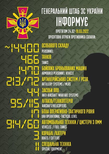 «Загальні бойові втрати противника з 24.02 по 19.03 орієнтовно склали: