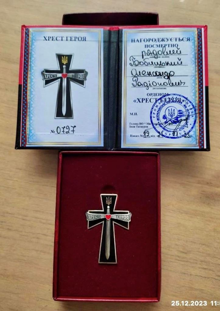 Наказом Голови ВО «Ми Українці» І.Татаурова № 82 від 21.11.2023 року нашого земляка, який віддав своє життя за незалежність та суверенітет нашої держави Бобицького Олександра Родіоновича нагородили орденом «Хрест Героя» посмертно.