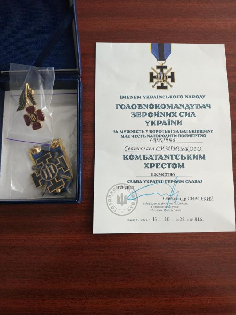 Сьогодні, 24 квітня, перед початком пленарного засідання сесії міської ради Рожищенський міський голова Вячеслав Поліщук та представники Другого відділу Луцького районного територіального центру комплектування та соціальної підтримки виконали почесну місію нагородження – вручили посмертну нагороду Святослава Васильовича Симінського з Носачевич – почесний нагрудний знак Головнокомандувача Збройних сил України Олександра Сирського «Комбатантський хрест» – мамі загиблого.