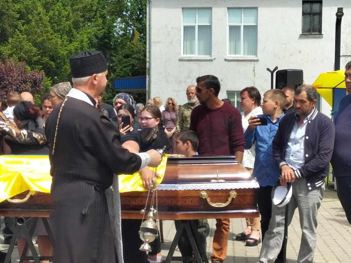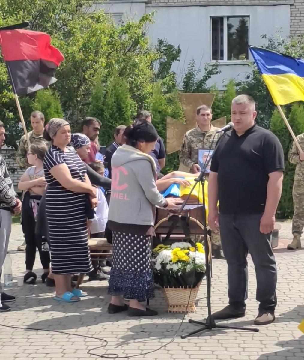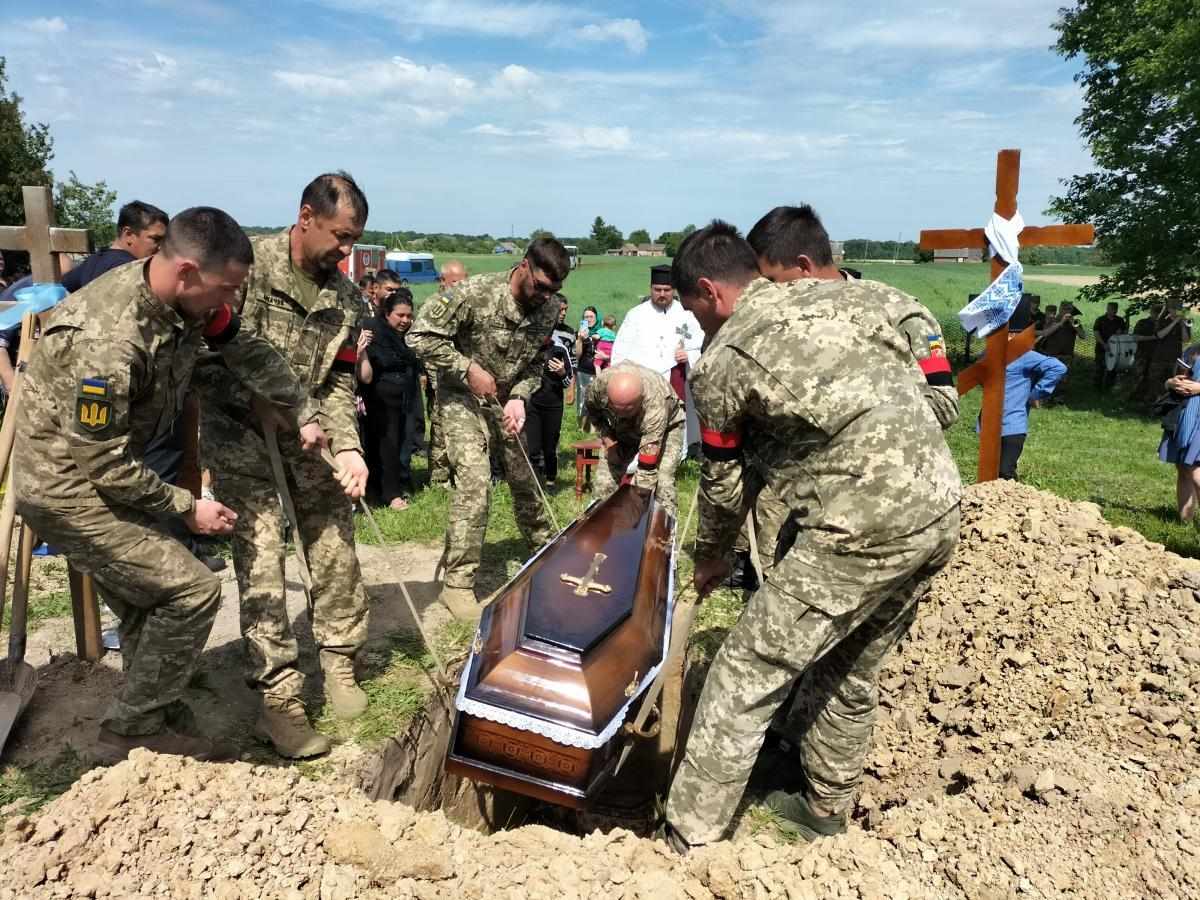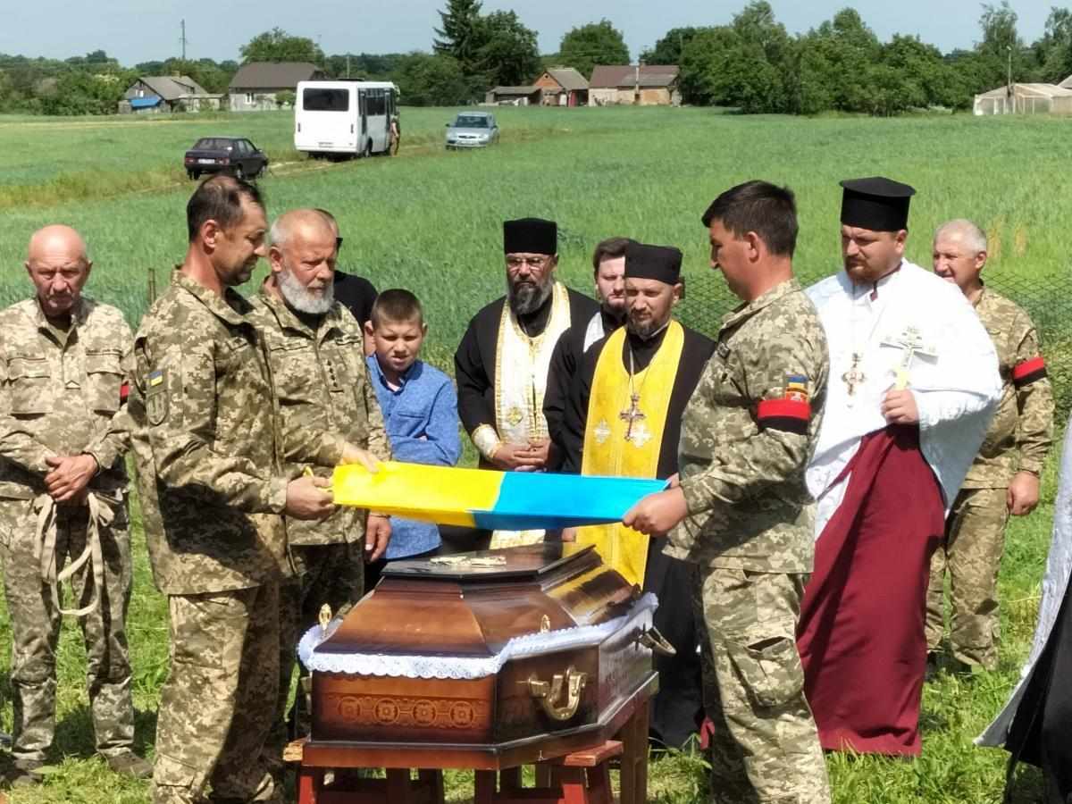 Під звуки військового оркестру та гучні постріли домовину з тілом опускають у холодну сиру землю. А Державний стяг, яким була вкрита домовина, військові передають синові Героя, як символ вільної та незалежної України, яку мужньо боронив і за яку віддав своє життя його батько.