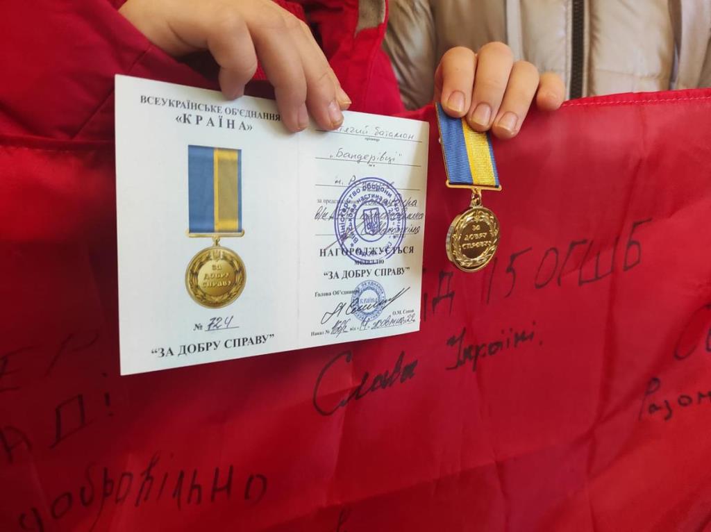 Сьогодні дитячому батальйону «Бандерівці» вручили нагороду «За добру справу», Подяку і прапор з підписами бійців з передової.