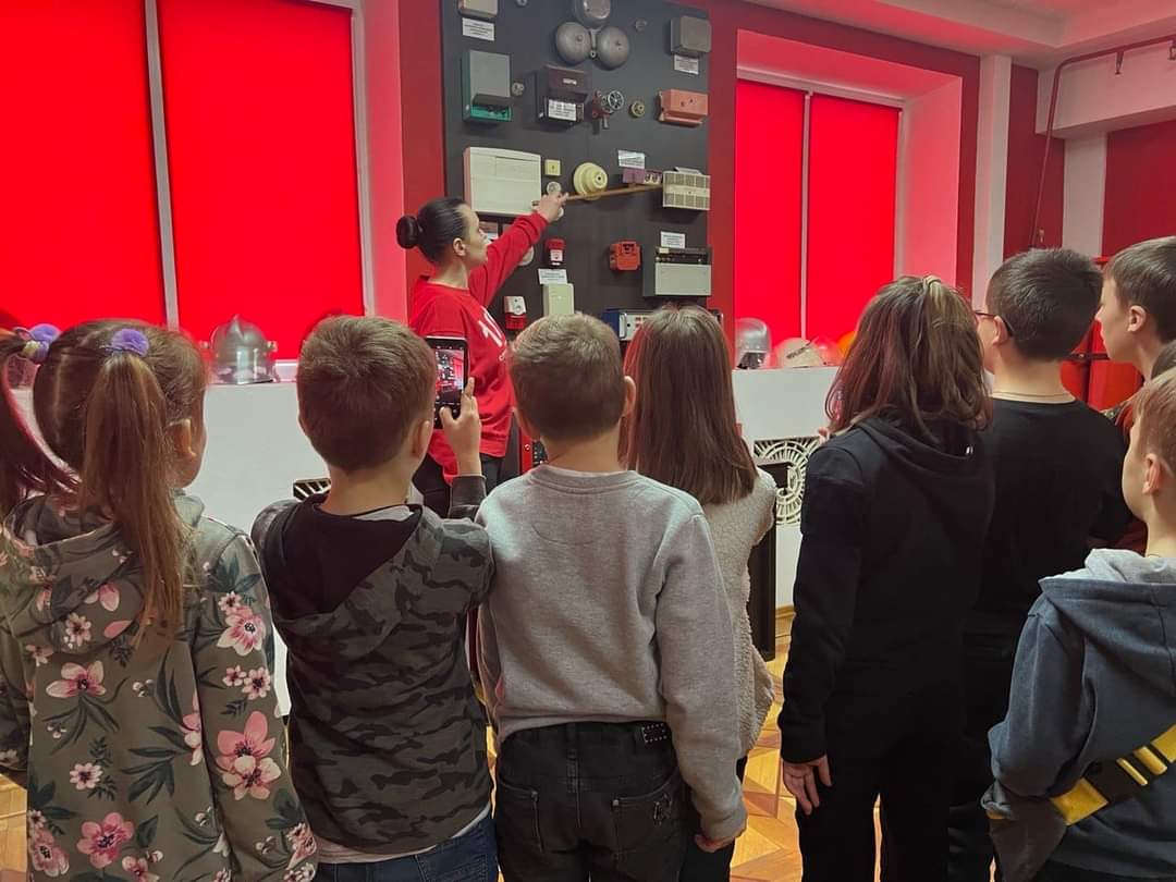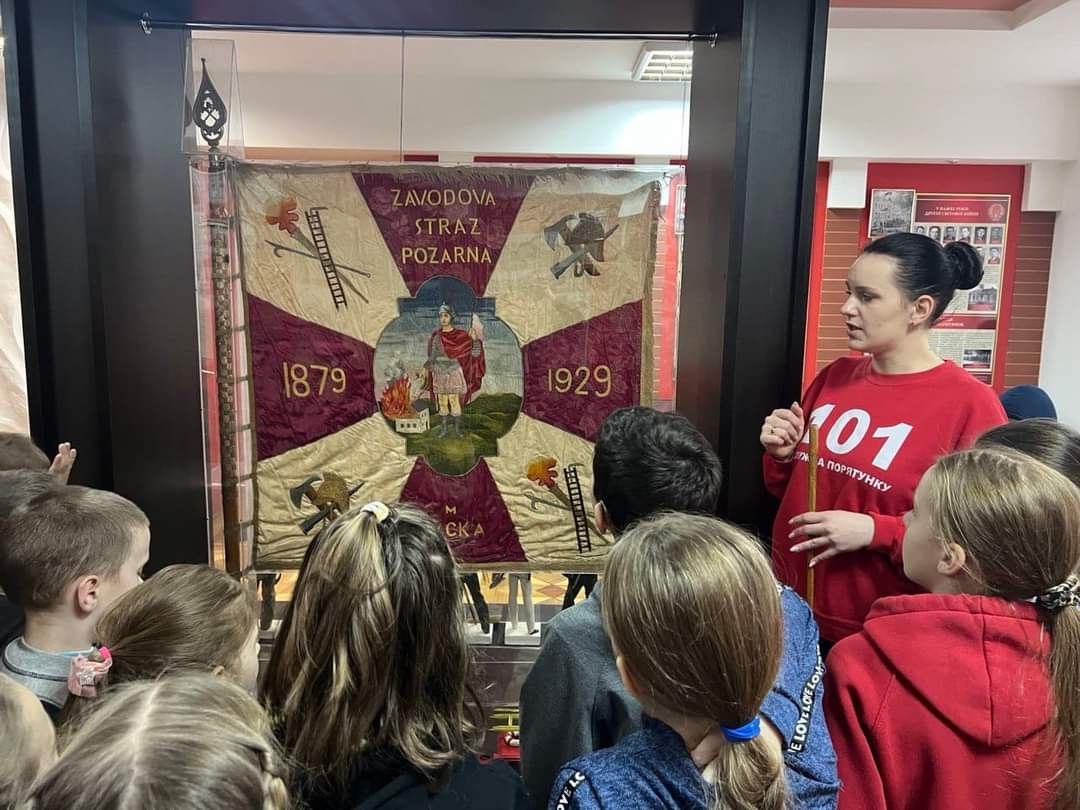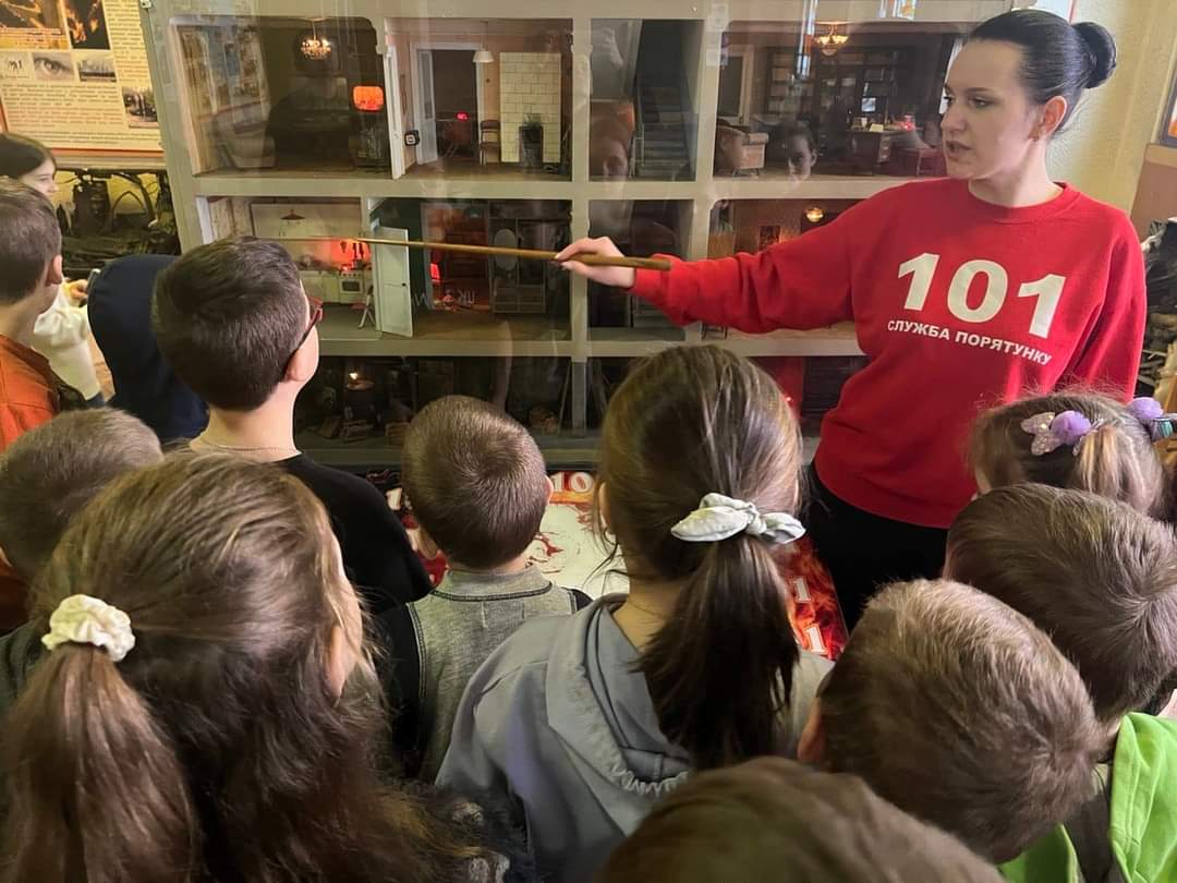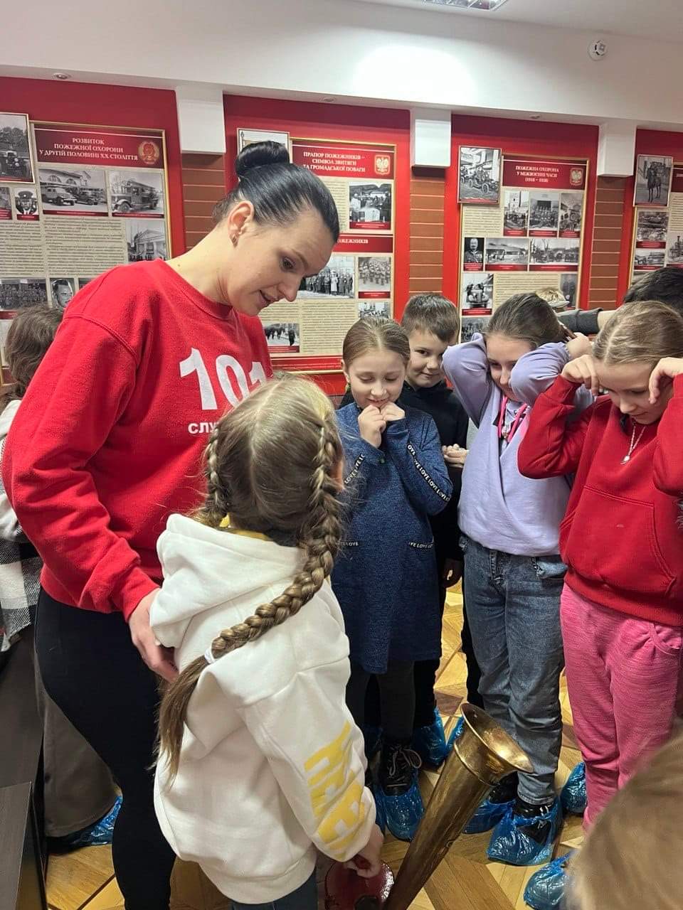 Екскурсовод розповіла дітям про те, як пожежники боролися з вогнем у давні часи та як за допомогою гучного сигналу Туфона сповіщали про тривогу. Гості побачили моделі пожежних автомобілів та приміряли каски, які одягали пожежники у ХХ ст.