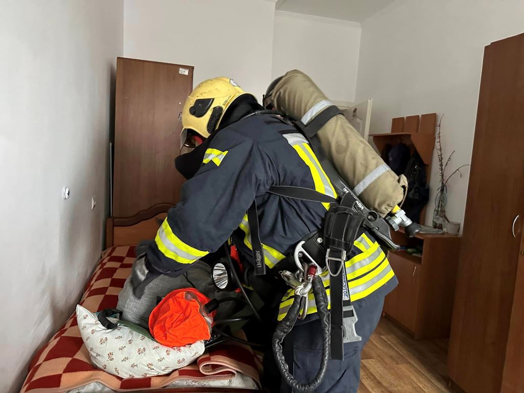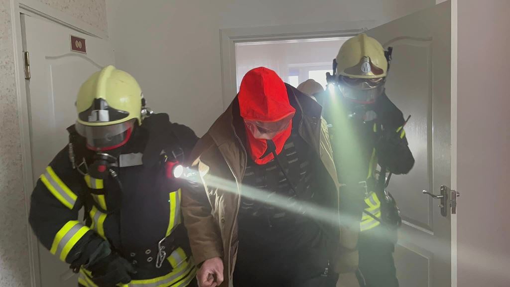 Умовна пожежа виникла в коридорі на третьому поверсі корпусу № 1, де ймовірно перебували два потерпілих. На місце події прибули рятувальники 1 державної пожежно-рятувальної частини які подали два спеціальні водяні стволи в ланках у апаратах на стисненому повітрі.