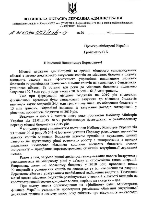 Голова облдержадміністрації звернувся до Прем’єр-міністра щодо розміщення тимчасово вільних коштів: він стверджує, що постанова Кабміну про заборону розміщувати тимчасово вільні кошти загального фонду на депозитних рахунках розбалансовує місцеві бюджети на 2019 рік.