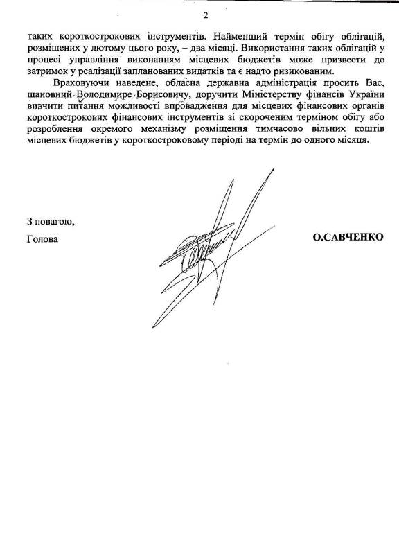 «Враховуючи наведене, обласна державна адміністрація просить Вас, шановний Володимире Борисовичу, доручити Міністерству фінансів України вивчити питання можливості впровадження для місцевих фінансових органів короткострокових фінансових інструментів зі скороченим терміном обігу або розроблення окремого механізму розміщення тимчасово вільних коштів місцевих бюджетів у короткостроковому періоді на термін до одного місяця»,– йдеться у листі.