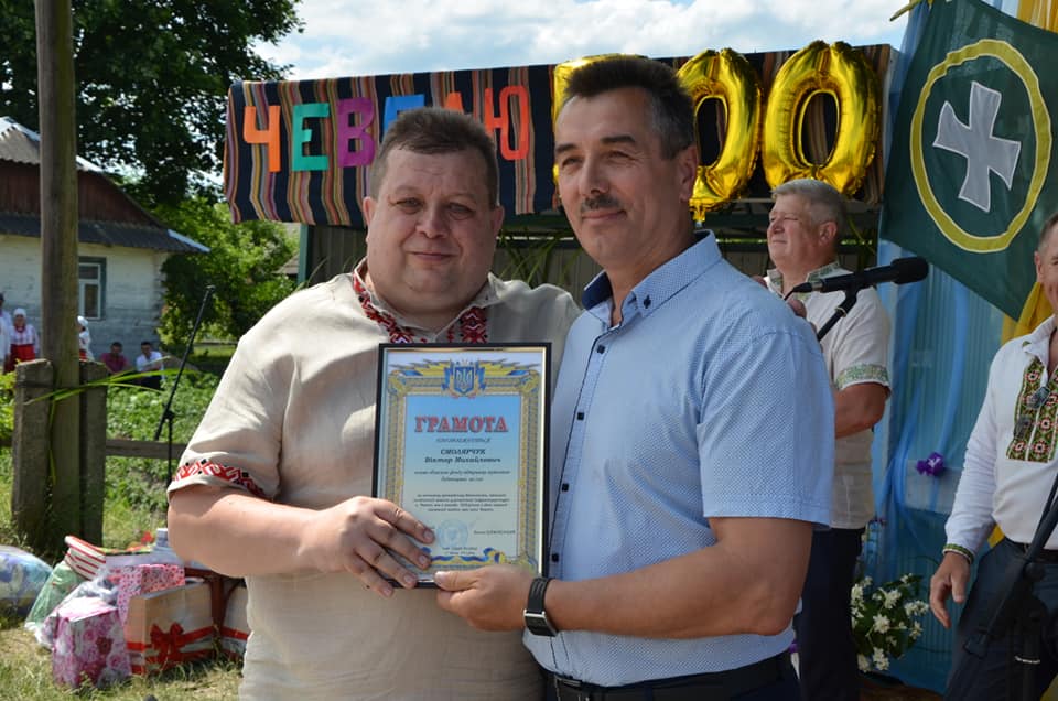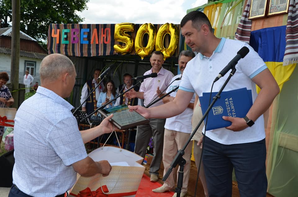 Григорій Недопад привітав присутніх із визначною датою та вручив громаді села пам’ятний гравертон із побажаннями миру, достатку і добра кожній родині. Також голова обласної ради вручив відзнаки Вячеславу Недзельському за популяризацію традицій, активну участь у громадському житті та створення символіки с. Чевель та Анатолію Бондару за активну співпрацю з громадою села Чевель.
