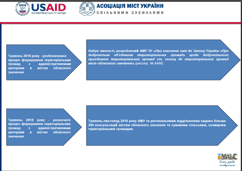 Саме тому Асоціації міст України спільно з комітетом Верховної Ради довелося розробляти законопроект, який передбачав таку можливість для міст обласного значення. Таким чином їх прирівняли до спроможних територіальних громад і була надана можливість сільським, селищним територіальним громадам приєднуватися до них. Асоціація міст України також розробила відповідний посібник, у якому розписано процедуру такого приєднання.
