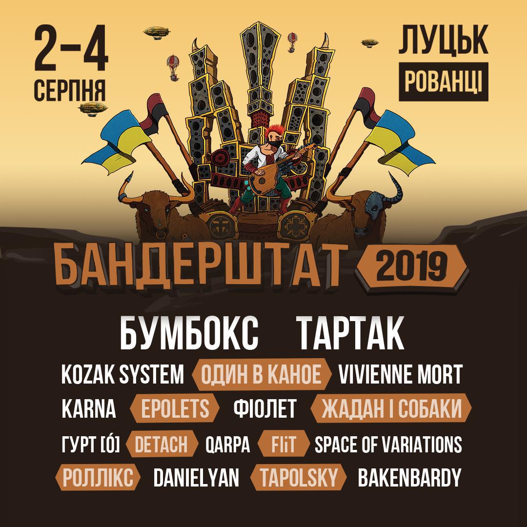 На музичній сцені виступлять топові українські гурти: “Бумбокс”, “Тартак”, “Kozak System”, “Один в каное”, “Vivienne Mort”, “Space of Variations”, “KARNA”, “Epolets”, “Qarpa”, “Роллікс”, “Фіолет”, “Жадан і Собаки”, “FliT”, “BAKENBARDY”, “DETACH”, Гурт “[O]”, Dj Tapolsky, Dan Alien, Святослав Бойко (Широкий Лан), Сергій Василюк (Тінь Сонця).