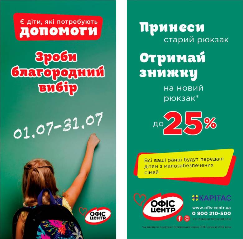 Мережа магазинів канцелярії «Офіс Центр» та благодійна організація «Карітас» працюють разом, щоб дати можливість зібратися до школи дітям з сімей, що не мають фінансової можливості на це. Акція «Благородний вибір» проходить п’ятий рік поспіль. Потрібно просто принести до магазину старий рюкзак, річ повинна бути чистою та придатною для використання.