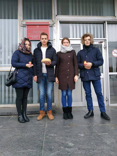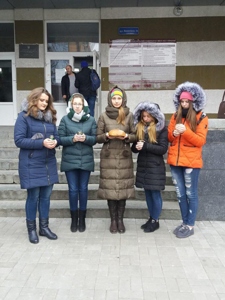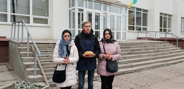 Дівчата і хлопці тримали запалені свічі та калач білого хліба. Кожен, хто заходив у навчальний корпус на навчання, зупинявся у скорботі та відламував шматок хліба.