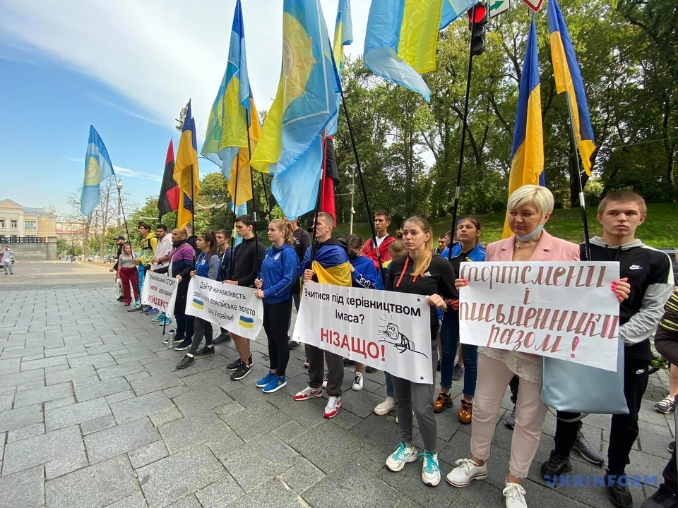 Як передає кореспондент «Укрінформу», студенти стоять з плакатами “Вчитися під керівництвом Імаса? Нізащо!”, “Спортсмени і письменники разом!”, “Дайте нам можливість завоювати олімпійське золото для України!”, “Плагіат – це злочин. Шкарлета у відставку!”, “Освіту від колапсу врятує тільки страйк!”.