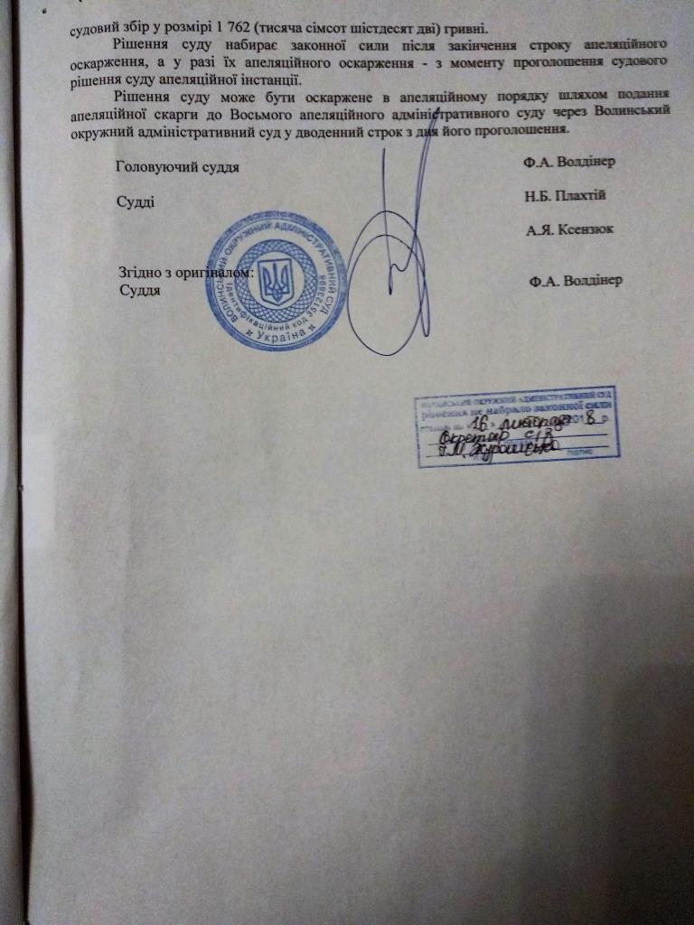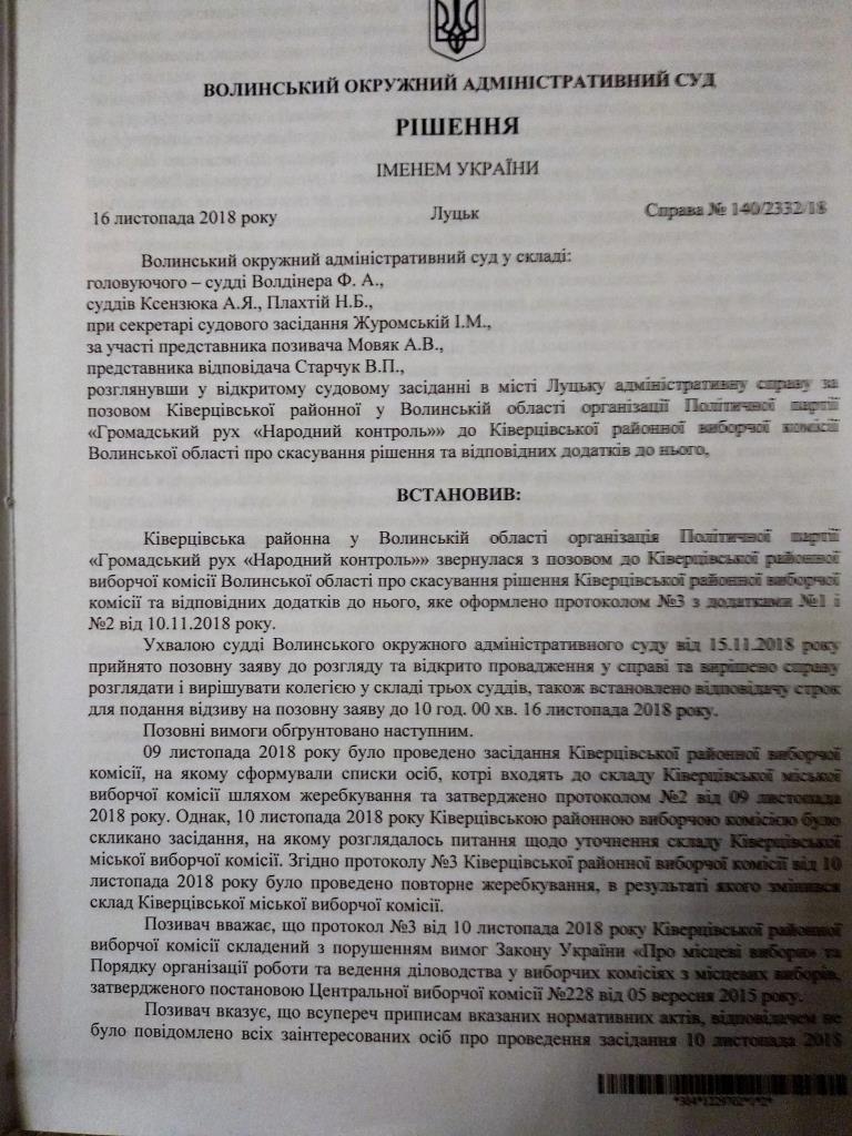 Суд задовольнив позов Ківерцівської районної організація політичної партії «Громадянський рух «Народний контроль» до Ківерцівської районної виборчої комісії щодо утворення та формування складу Ківерцівської міської ТВК.