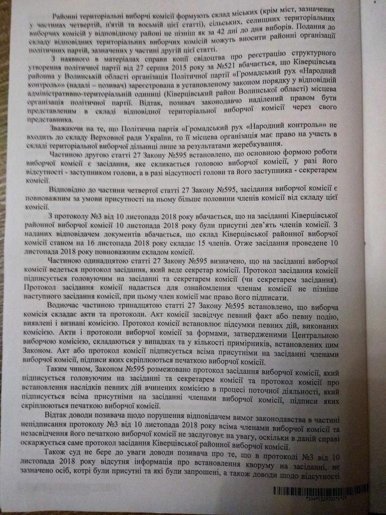 Ківерцівська районна організація політичної партії «Громадянський рух «Народний контроль» позивалася до Ківерцівської районної виборчої комісії щодо скасування рішення та відповідних додатків до нього. Позивач вважав, що протокол складений із порушенням вимог законодавства.