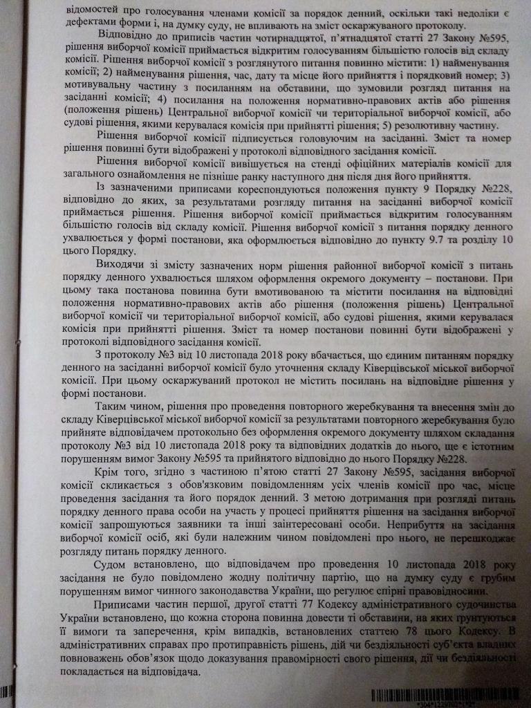 Суд відзначив, що рішення комісії оформили складанням протоколу, що є порушенням порядку ведення діловодства виборчою комісією. Про повторне засідання не повідомили жодну політичну партію, що на думку суду є грубим порушенням виборчого законодавства.
