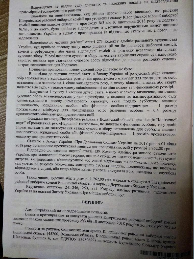 «Визнати протиправним та скасувати рішення Ківерцівської районної виборчої комісії про уточнення складу Ківерцівської міської виборчої комісії винесене шляхом складання протоколу № 3 від 10 листопада та додатків № 1, № 2 до нього», – йдеться у рішенні суду.