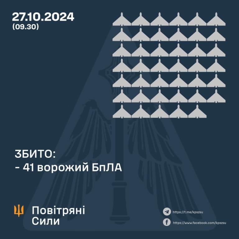 Сили оборони збили 41 російський безпілотник із 80, якими російські загарбники з вечора 26 жовтня атакували Україну, ще 32 – локаційно втрачені, один полетів у напрямку білорусі.