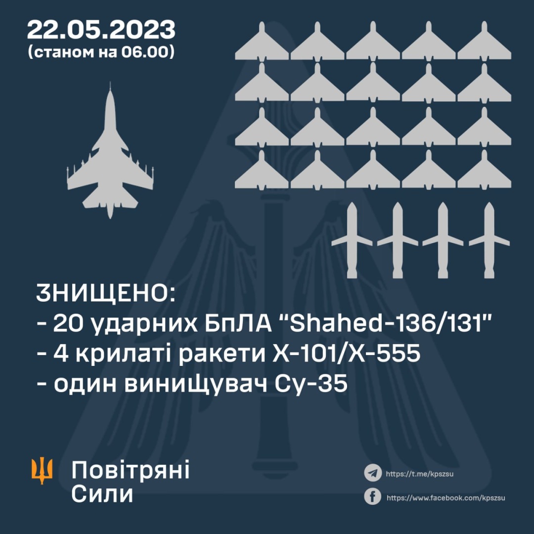 Протягом нічної атаки 22 травня сили та засоби протиповітряної оборони повітряного командування “Схід” та повітряного командування “Південь” на східному та південному напрямках відповідно знищили чотири крилаті ракети Х-101/Х-555 та 20 ударних дронів типу “Shahed”.