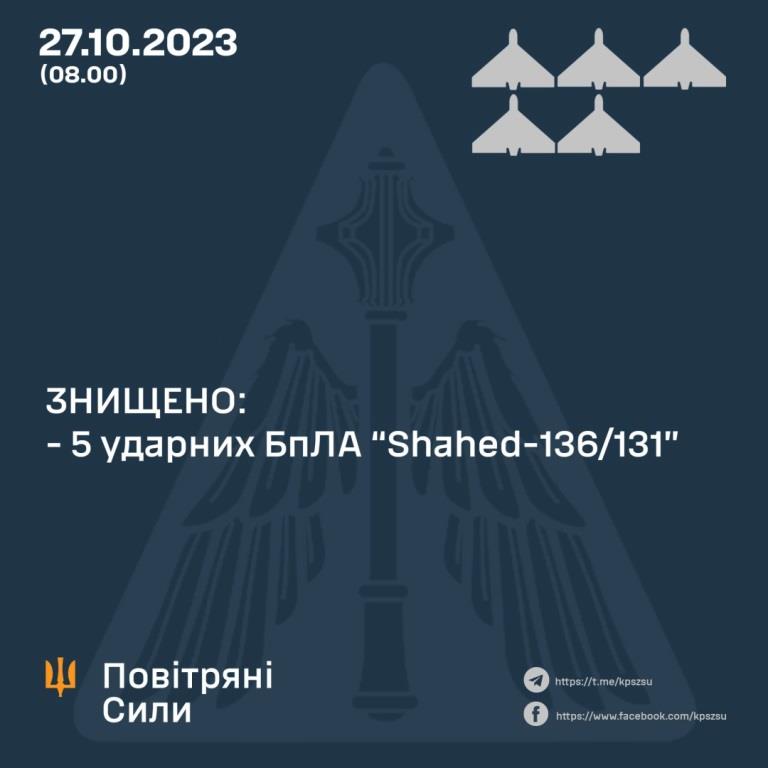 П’ять ворожих безпілотників знищені в результаті бойової роботи Повітряних сил у взаємодії з ППО Сил оборони України.