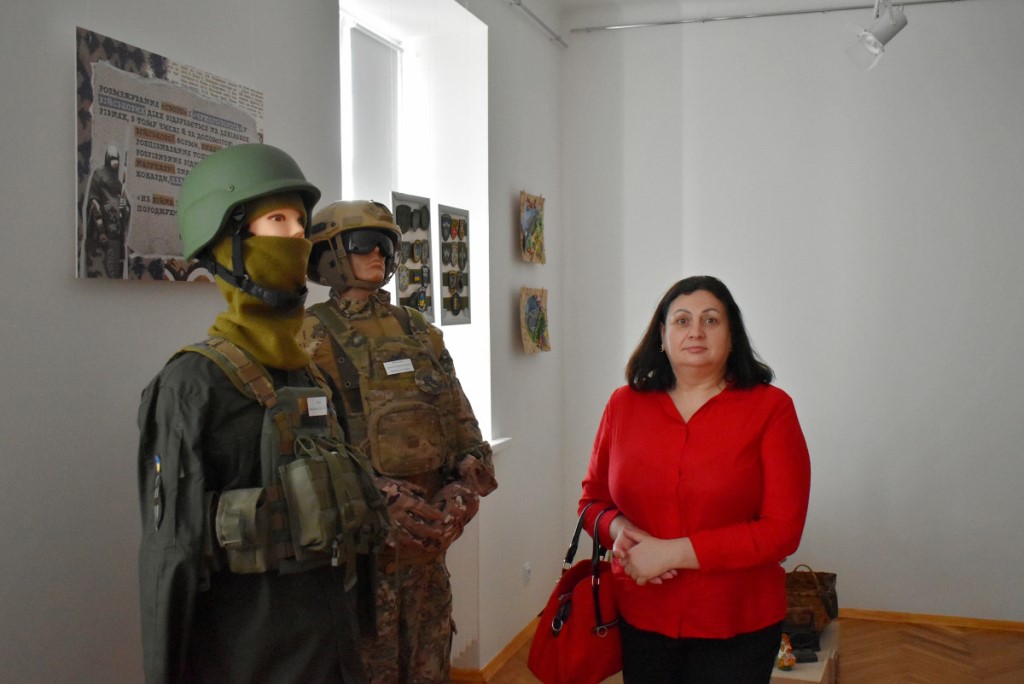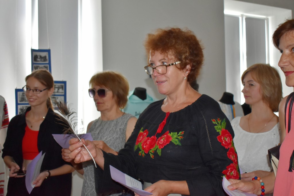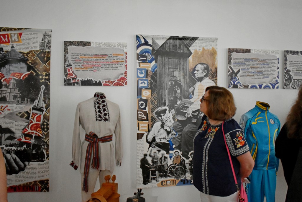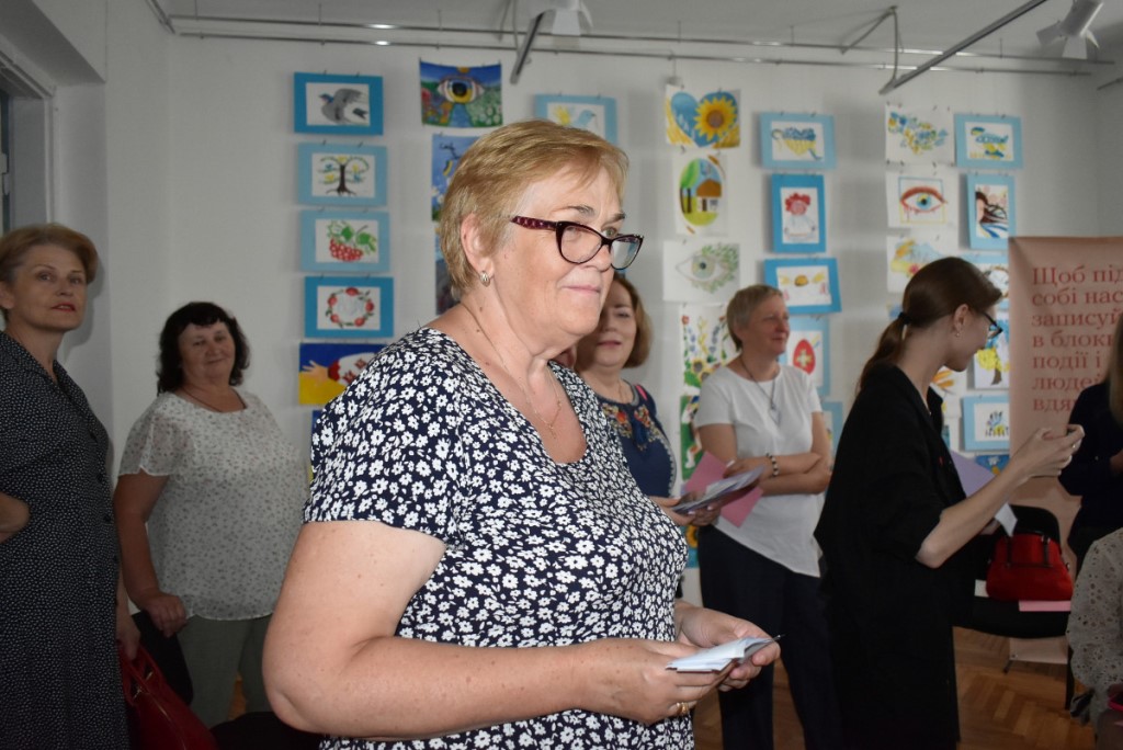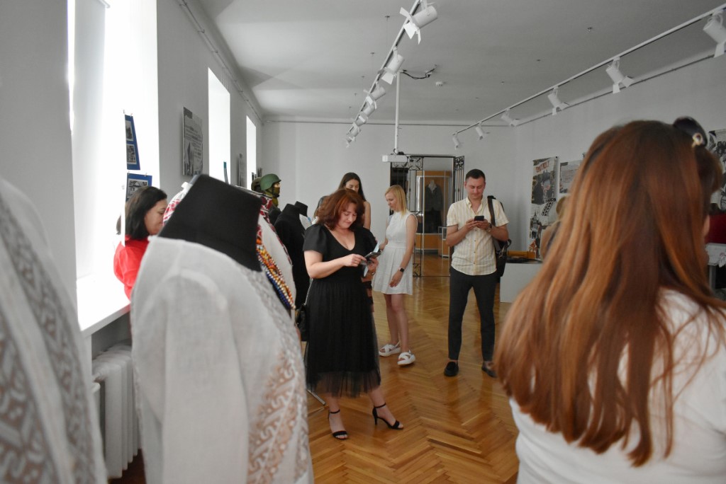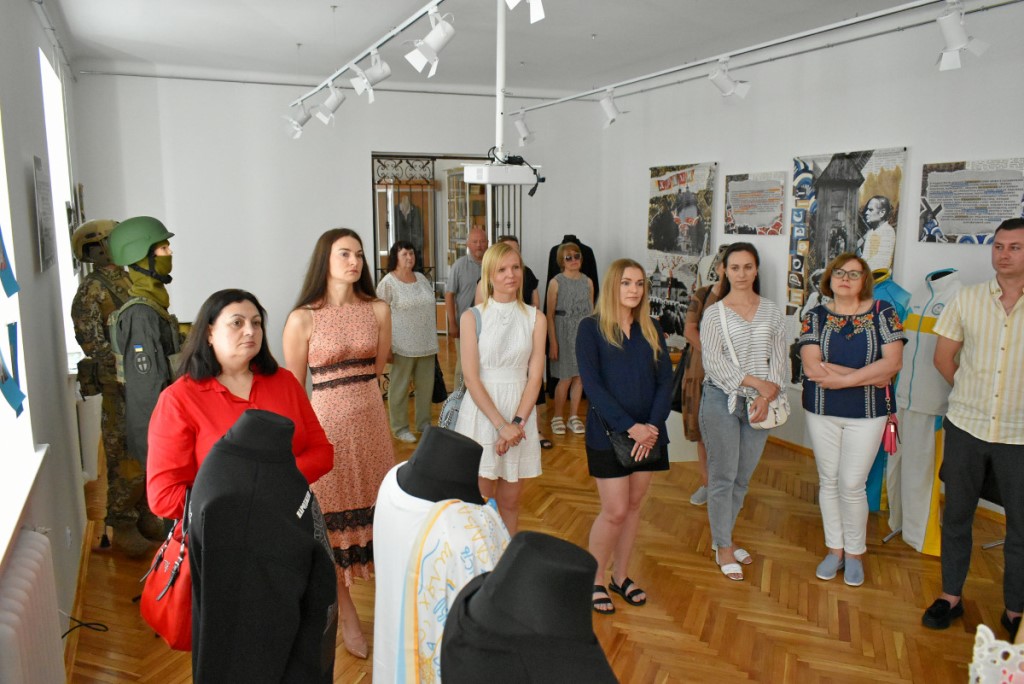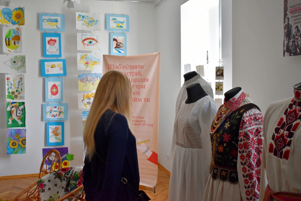 Також вона підкреслила, що популярним напрямком психосоціальної підтримки у сфері культури є терапія мистецтвом. Тож учасники заходу ознайомилися з експонатами виставки «Свій/Чужий. Історії про…». Еспозиція розрахована на різну аудиторію та містить традиційні українські весільні вишиванки, дитячі малюнки, вбрання нацгвардійця та воїна 3-ої штурмової бригади ЗСУ, а також розпізнавальні знаки представників різних професій.