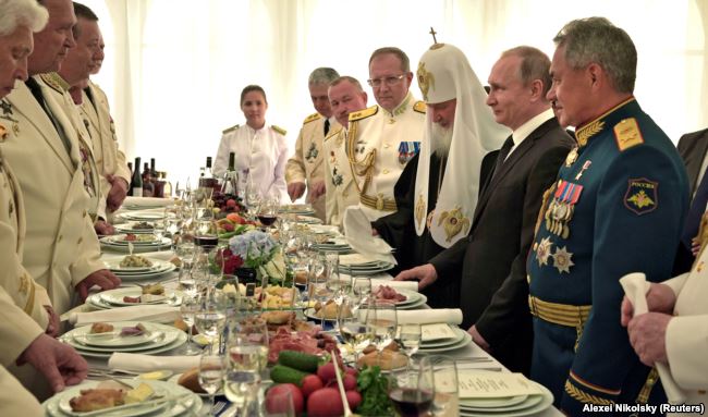 Справа наліво: міністр оборони Росії Сергій Шойгу, російський президент Володимир Путін і Московський патріарх Кирило. Російський Петербург, 30 липня 2017 року
