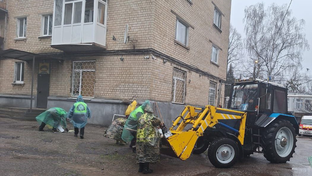 Комунальні служби продовжують прибирати бите скло і сміття та закривають віконні контури.