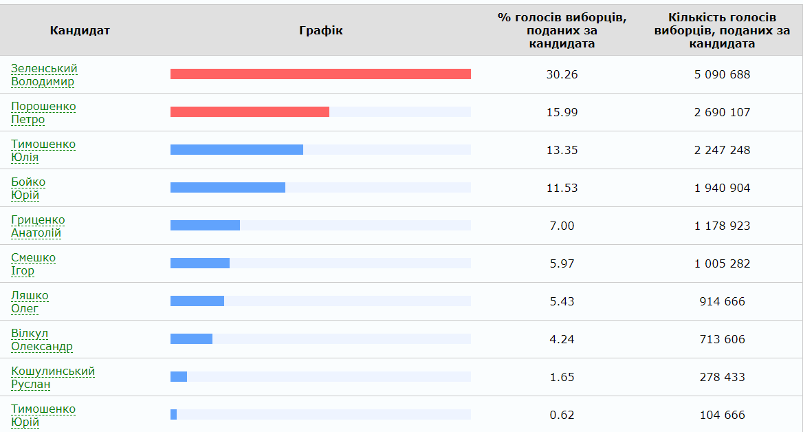 Опрацювали наразі 90,08 % протоколів: 30,26 % набирає Володимир Зеленський, 15,99 % – Петро Порошенко, 13,35 % – Юлія Тимошенко, 11,53 % – Юрій Бойко, 7,00 % – Анатолій Гриценко, 5,97 % – Ігор Смешко, 5,43 % – Олег Ляшко, 4,24 % – Олександр Вілкул, 1,65 % – Руслан Кошулинський.