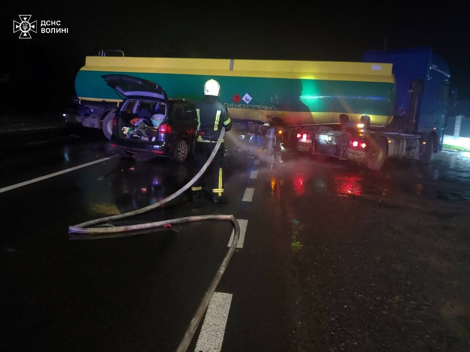 ЮУчора, 7 жовтня, о 20:57 на лінію 101 надійшло повідомлення про дорожньо-транспортну пригоду в селі Дачне Луцької громади: зіткнулися легковик та вантажний автомобіль, що транспортував пальне, стався витік пального із пошкодженої секції бензовоза.
