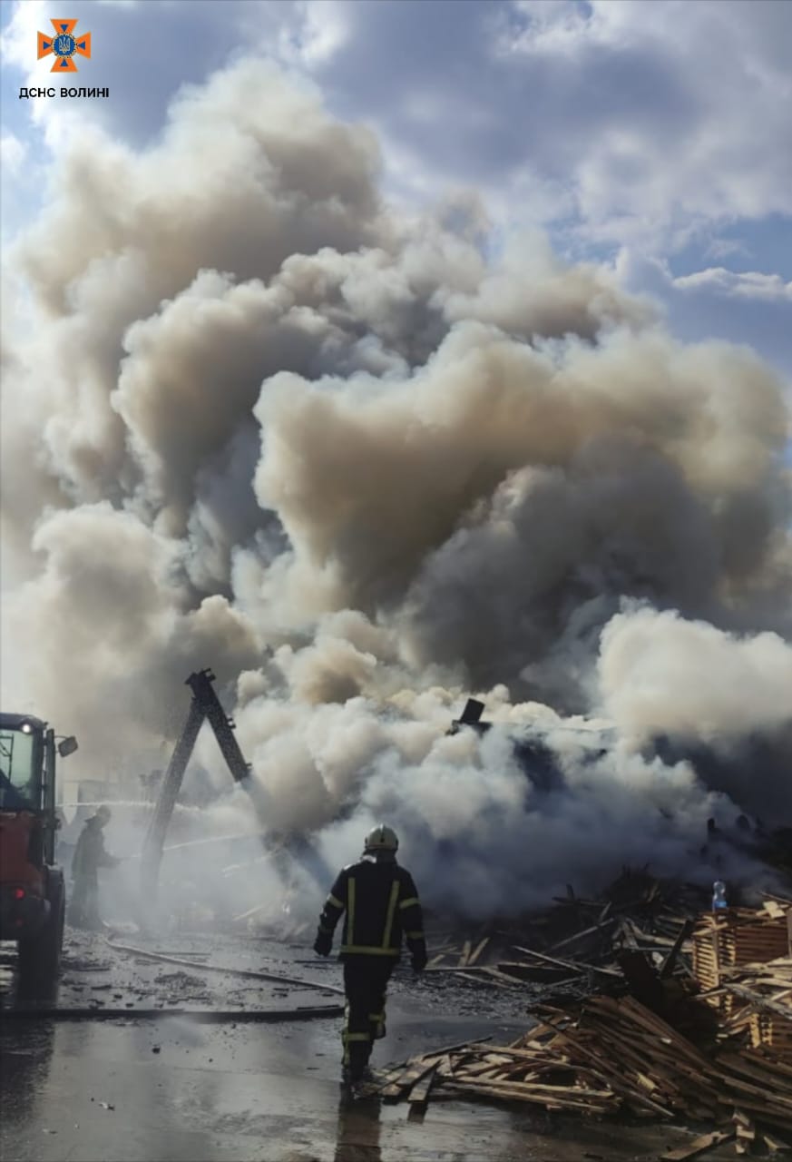 Повідомлення про пожежу на пилорамі в селі Брониця Камінь-Каширського району до служби 101 надійшло о 13:10. Загорівся склад із готовою продукцією та деревина на відкритій території.