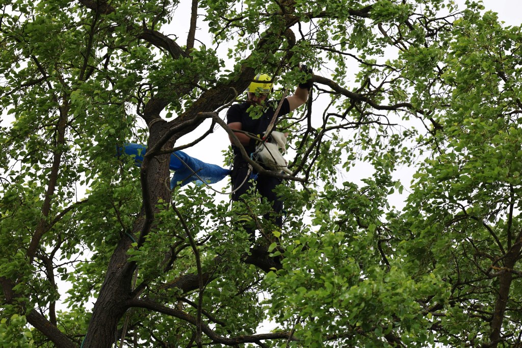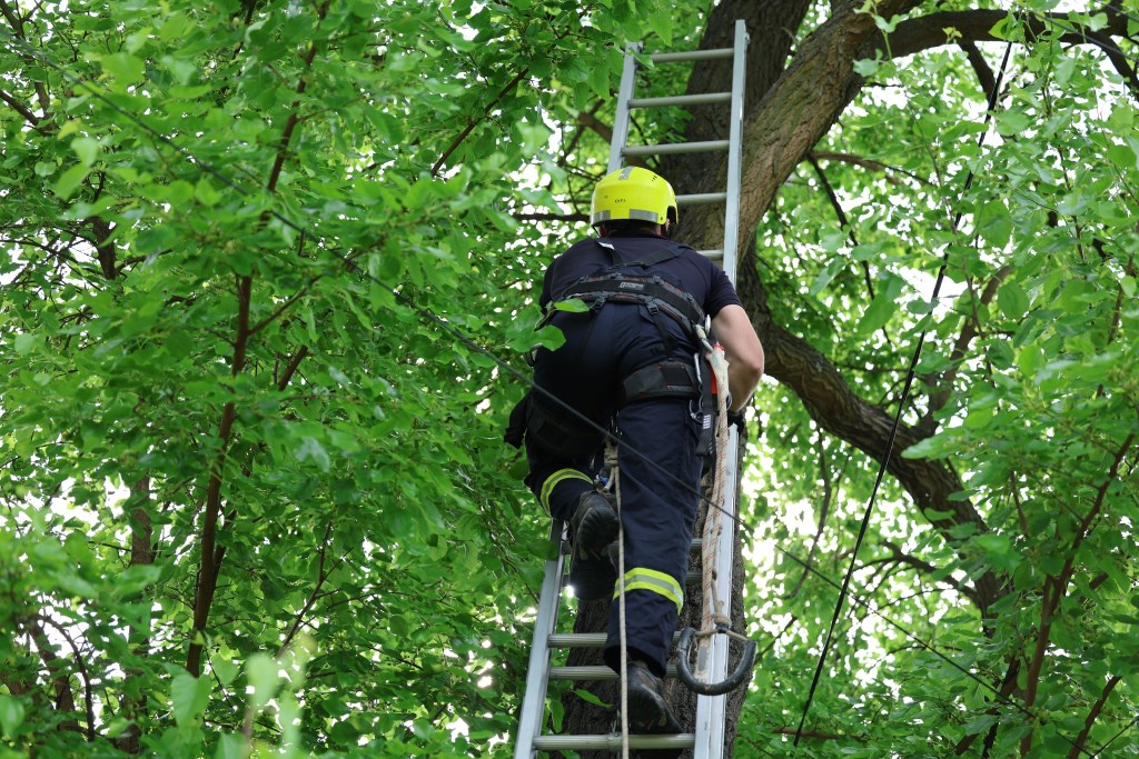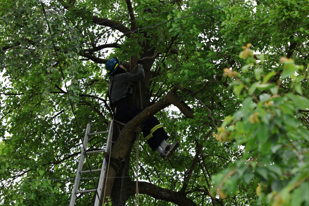 Разом із командою він встановив триколінну драбину, зафіксував її мотузками, одягнув альпіністське спорядження й почав підйом. На висоті — додаткове страхування на гілках. Унизу — надійна підтримка товаришів.