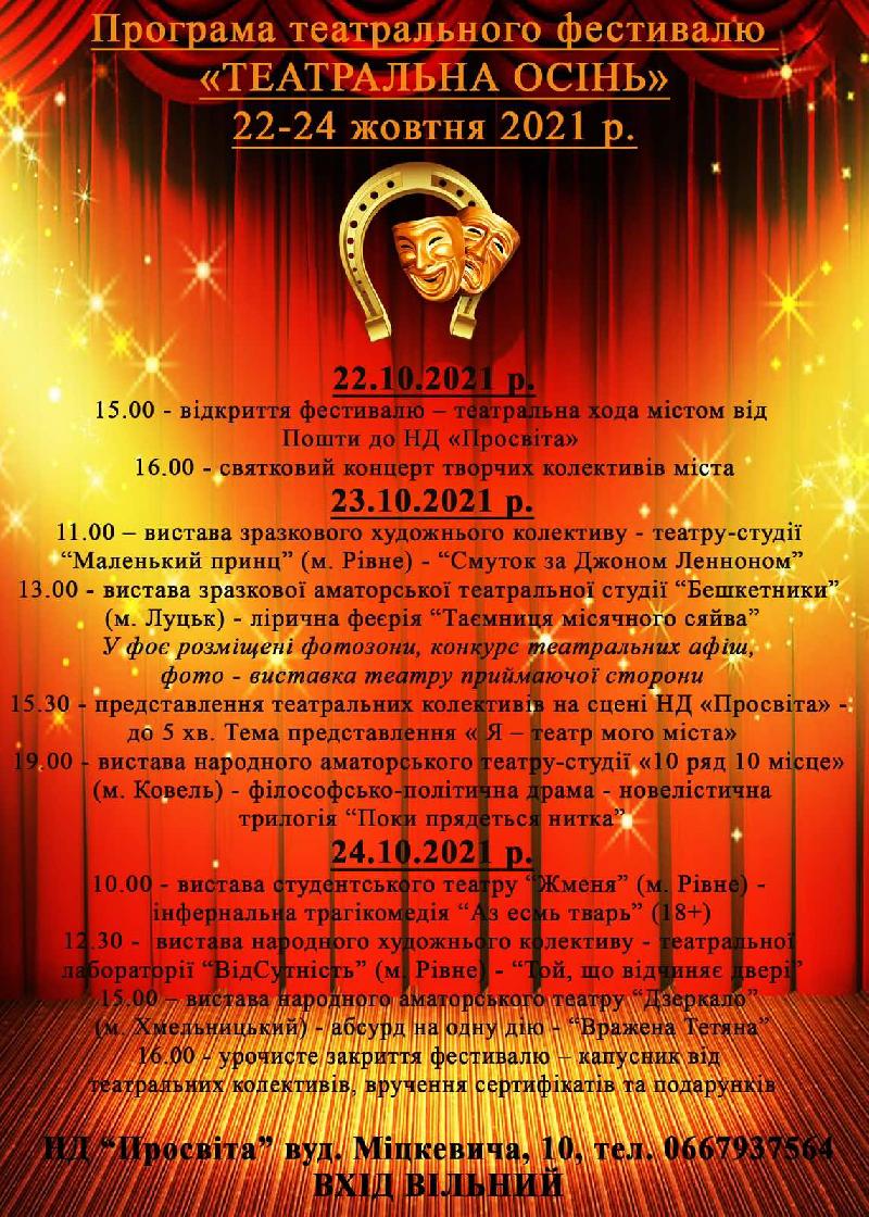 Незабаром – найочікуваніша подія осені – І відкритий фестиваль театрального мистецтва «Театральна осінь». Організатор – управління культури, молоді та спорту виконавчого комітету Ковельської міської ради.