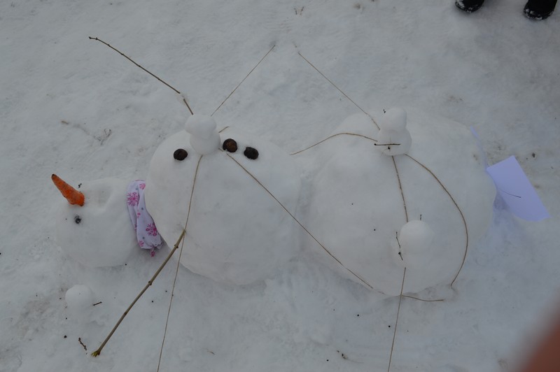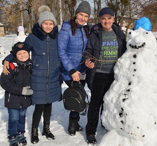 Перше місце здобула колективна робота родин Кривдіків та Поляків. Кажуть, що татко пообіцяв дітям зліпити сніговика-гіганта. І цю ідею вони й реалізували. А так як працювала велика команда однодумців, то поряд ще встановили дві фігури. Вийшла весела сімейка.