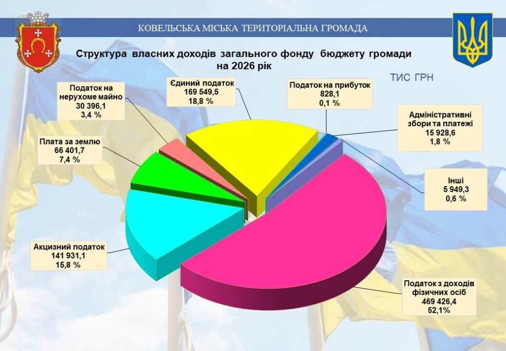 Дохідну частину сформували в обсязі 1,191 мільярда гривень. Власні надходження до загального фонду прогнозуються на рівні 900 млн грн, з яких понад половину становить податок та збір на доходи фізичних осіб.