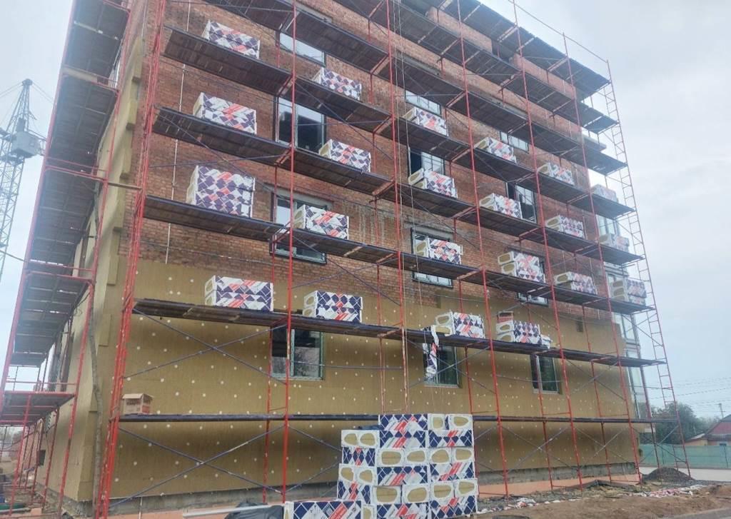 Розпочали черговий етап будівництва важливого для інфраструктури міста об’єкту — теплоізоляційні роботи. Зовнішні стіни будинку утеплятимуть мінеральною ватою за технологією «Влаштування фасадної теплоізоляції з опорядженням штукатурками».