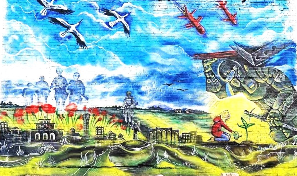 Ескіз для муралу створила Аліна Ткачук. За словами художниці, вони довго працювали над проектом, аби показати на картині сьогодення.