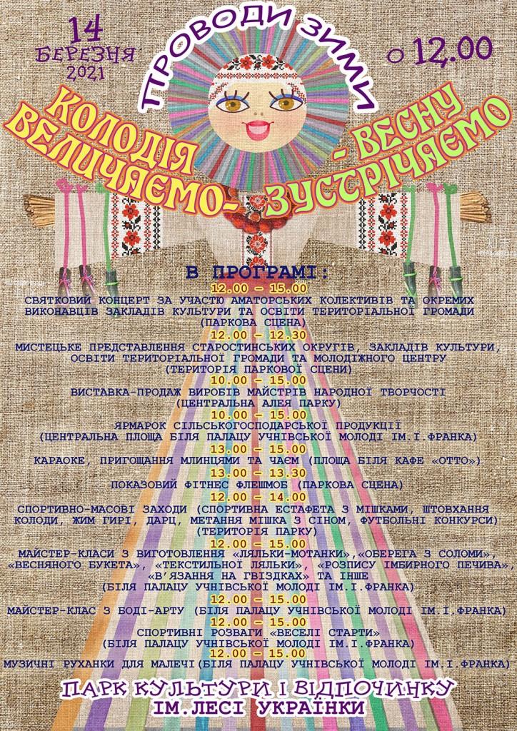 Проводи зими відбудуться 14 березня о 12:00 у парку культури та відпочинку імені Лесі Українки.