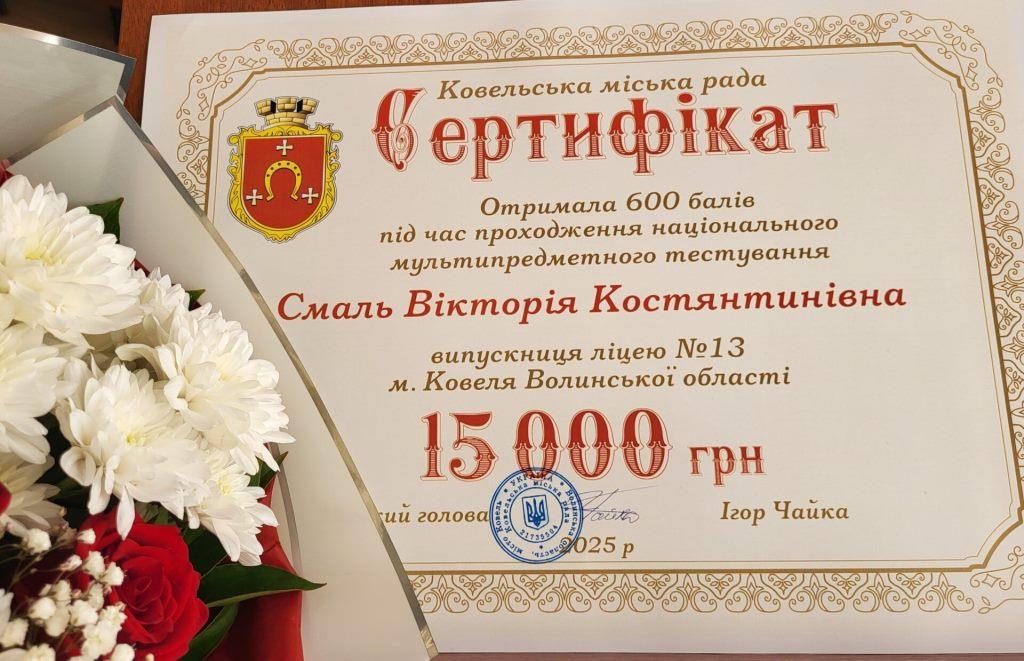 У Ковелі стало доброю традицією нагороджувати найуспішніших випускників. Цього разу на початку 66-ї сесії міський голова Ігор Чайка вручив сертифікат на 15 000 гривень Вікторії Смаль — учениці ліцею № 13, яка єдина в громаді отримала найвищі 600 балів на основній сесії Національного мультипредметного тесту.