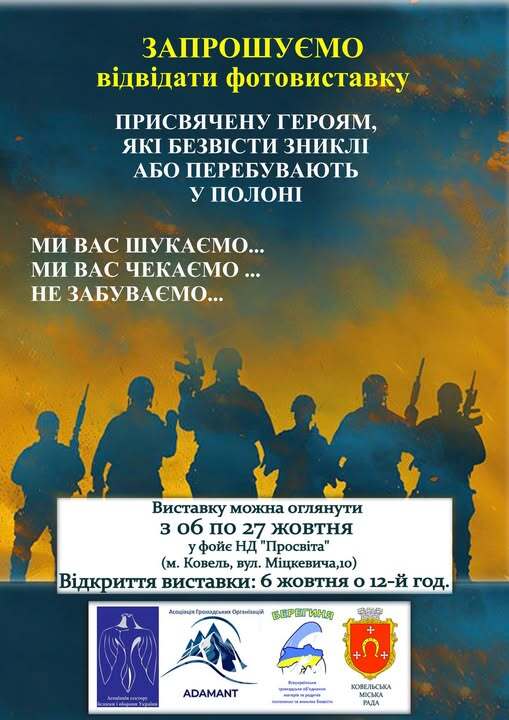 У народному домі «Просвіта» (м. Ковель, вул. Міцкевича, 10) розгорнуть фотовиставку, присвячену Героям, які зникли безвісти або перебувають у полоні.