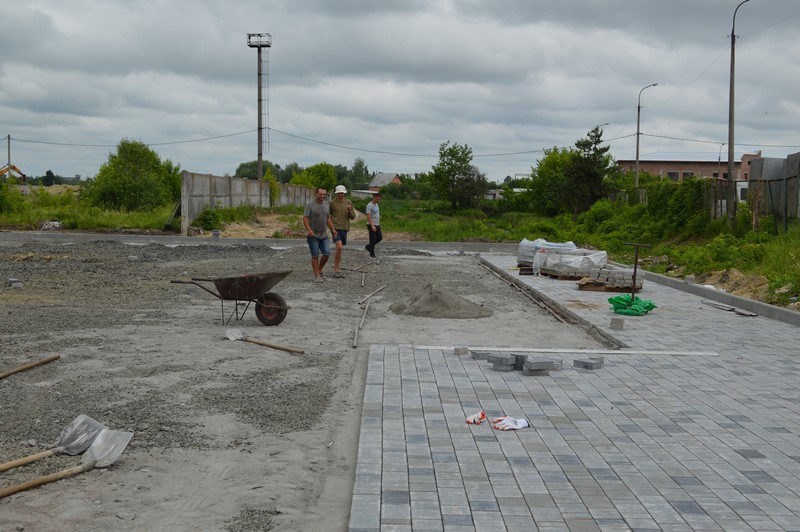 Спеціалісти ПП «МП Нововолинськсантехмонтаж» займаються благоустроєм прилеглої території, викладанням бруківки на території майбутніх місць паркування автотранспорту.