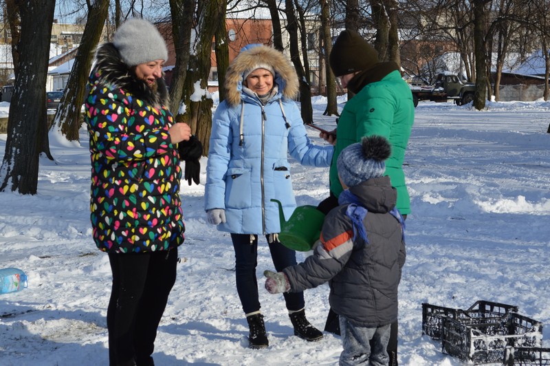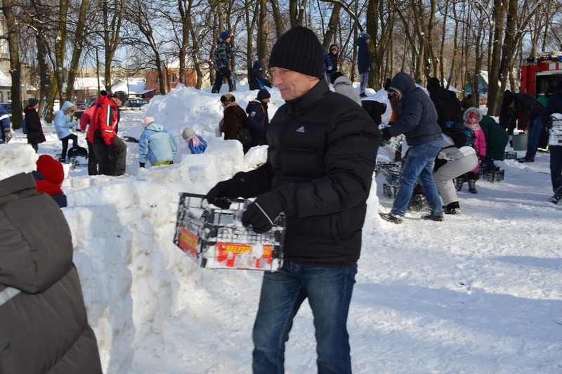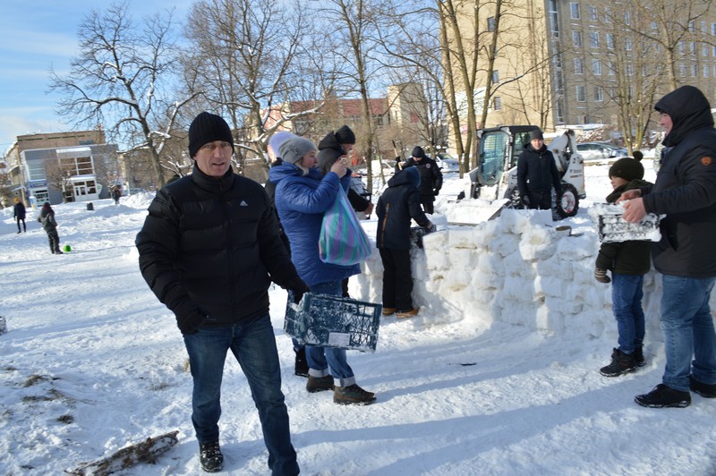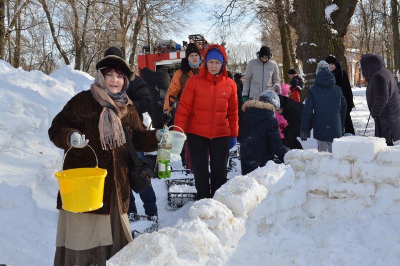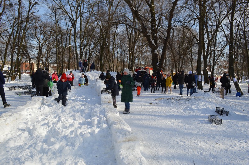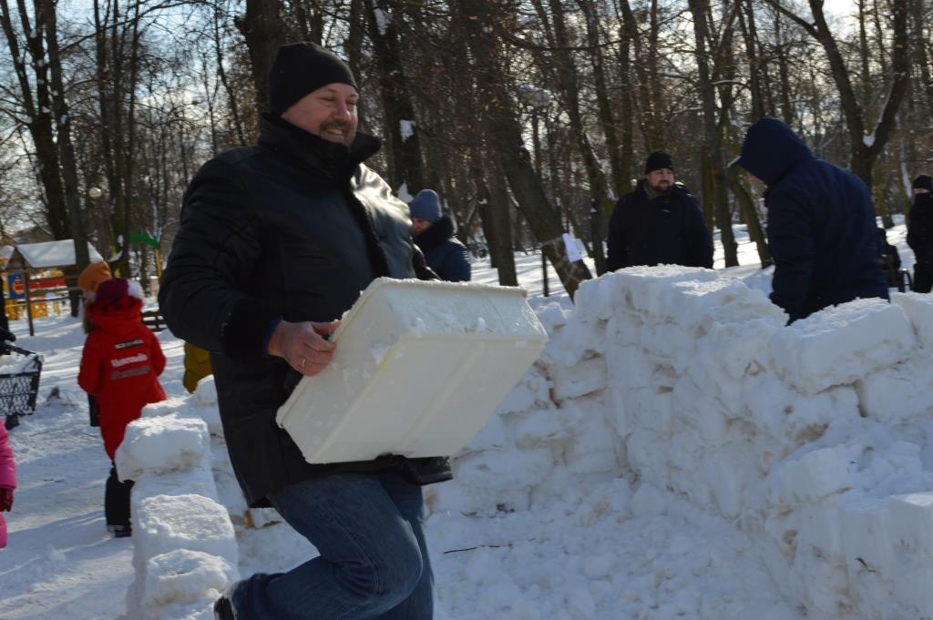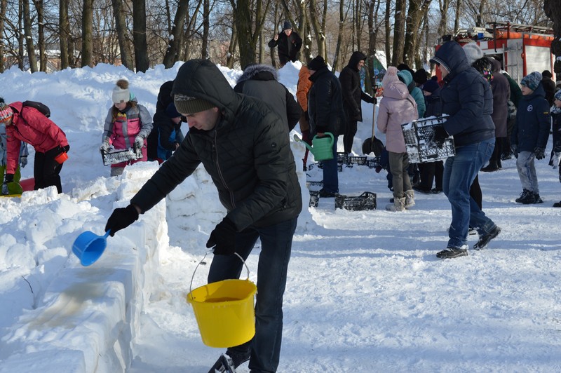 Снігове містечко 13 лютого зводили у парку культури і відпочинку. Крижані цеглини складали діти й дорослі. Вони не побоялись морозу і прийшли на зимову забаву, на яку їх запросив міський голова Ігор Чайка.