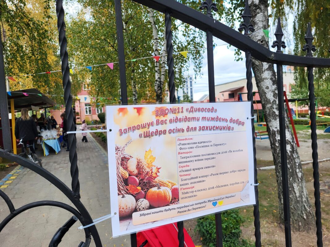 ЗСУ підтримують навіть наймолодші. У ЗДО № 11 «Дивосад» триває тематичний тиждень добра «Щедра осінь для захисників». Усі заходи, які проходять упродовж цих днів, мають благодійну мету – підтримати Збройні Сили України.