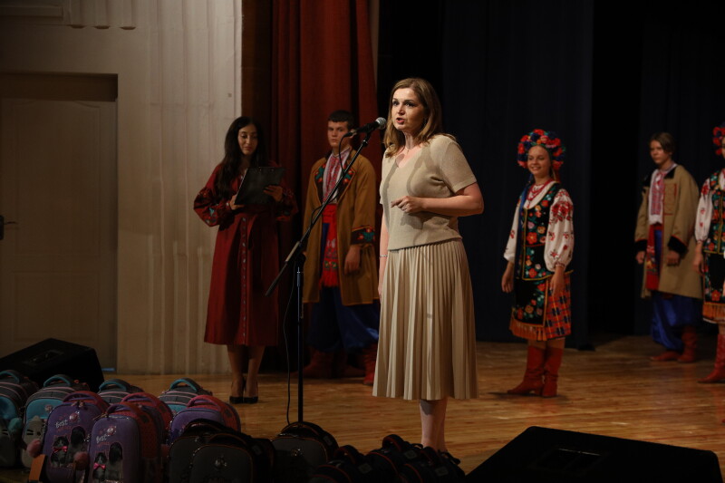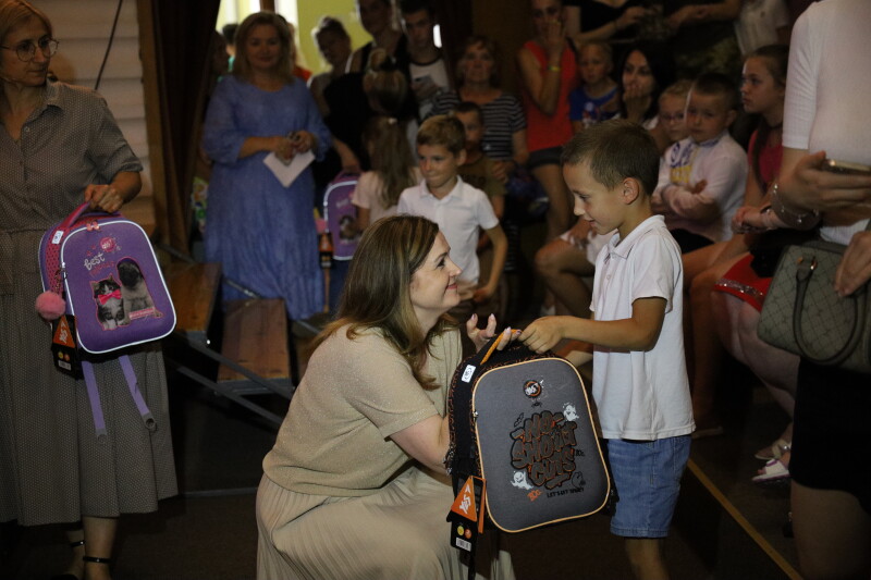 Присутніх також привітала заступник міського голови Ірина Чебелюк. Вона ж вручила першокласникам та школярам рюкзаки з повним набором навчального приладдя – зошитами, ручками, щоденником, альбомом, фарбами, пластиліном, ножицями, клеєм, олівцями.