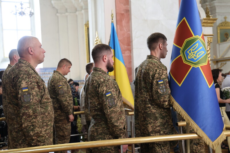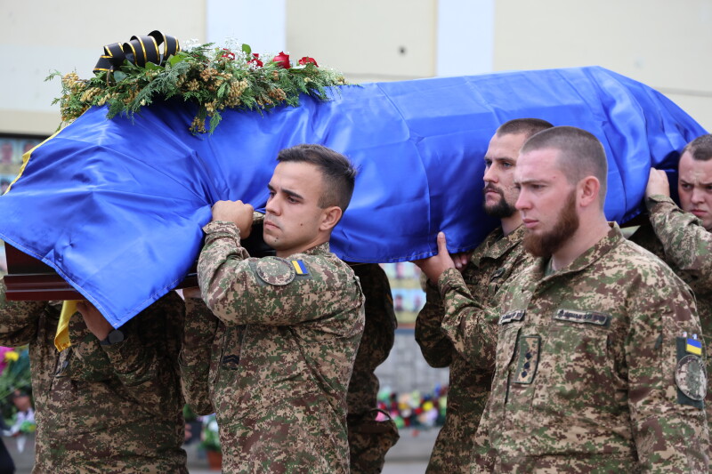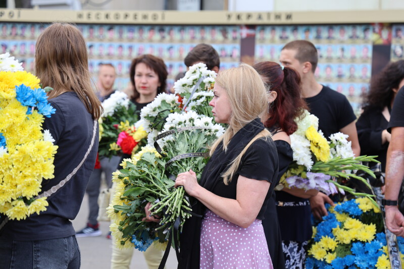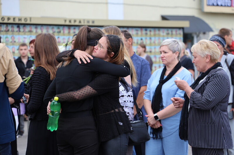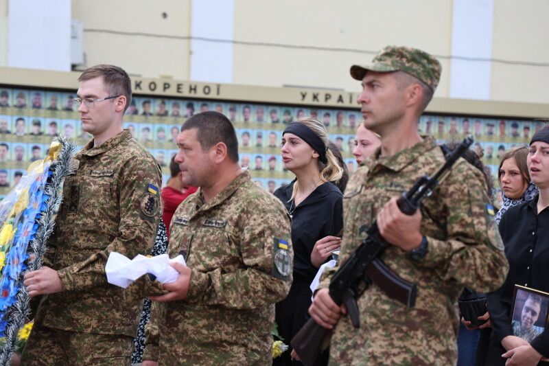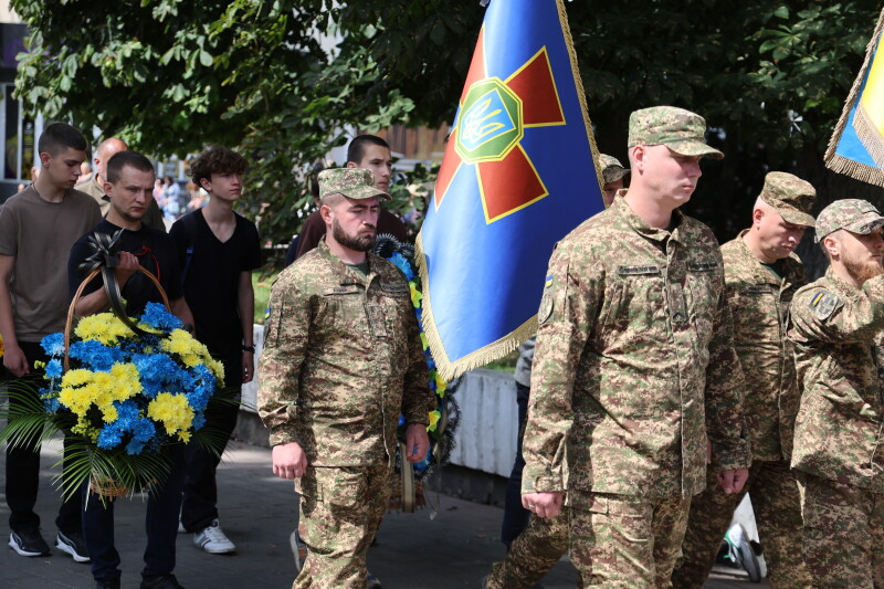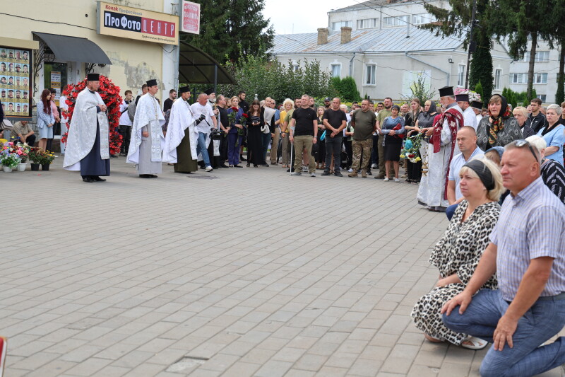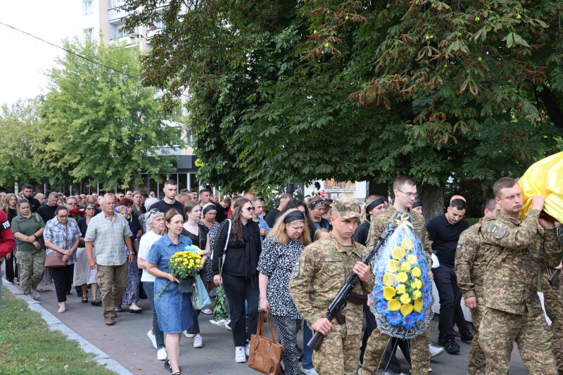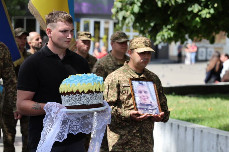 Після завершення заупокійного богослужіння труну з тілом захисника пронесли Театральним майданом. Біля пам’ятного фотостенда загиблим Героям траурна процесія зупинилася і виконала Державний Гімн.