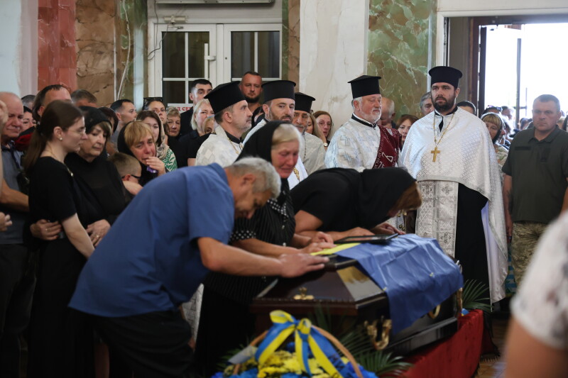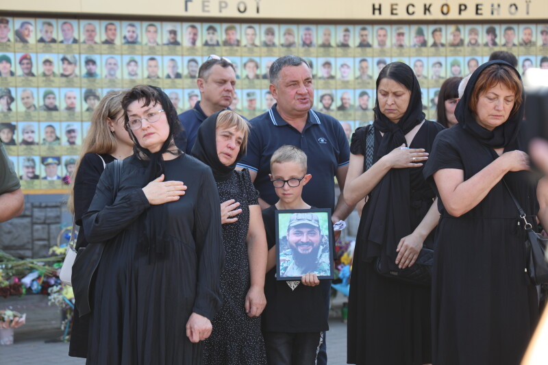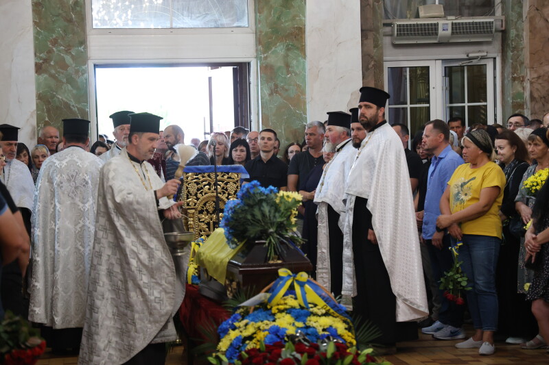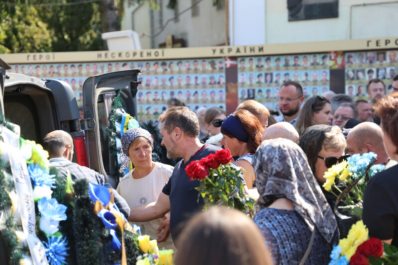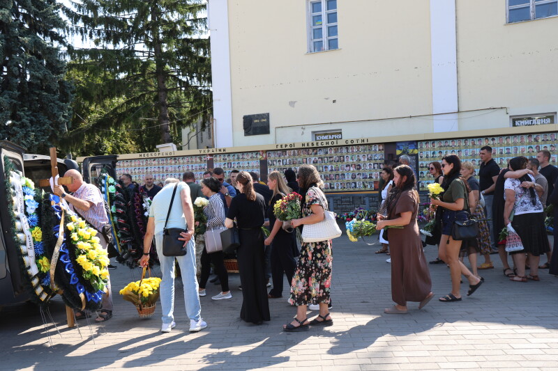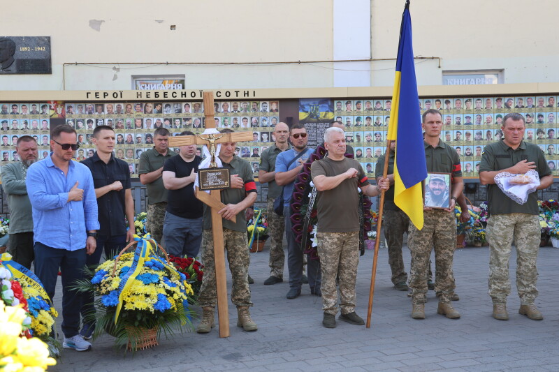 Після завершення богослужіння труну з тілом захисника пронесли Театральним майданом. Біля пам’ятного фотостенду загиблим Героям траурна процесія зупинилися і виконала Державний Гімн.