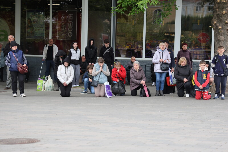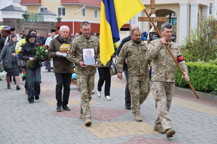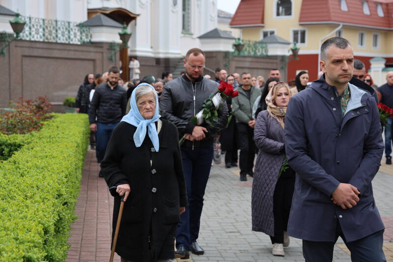 Після завершення богослужіння труну з тілом захисника пронесли Театральним майданом. Біля пам’ятного фотостенда загиблим Героям траурна процесія зупинилася і виконала Державний Гімн.