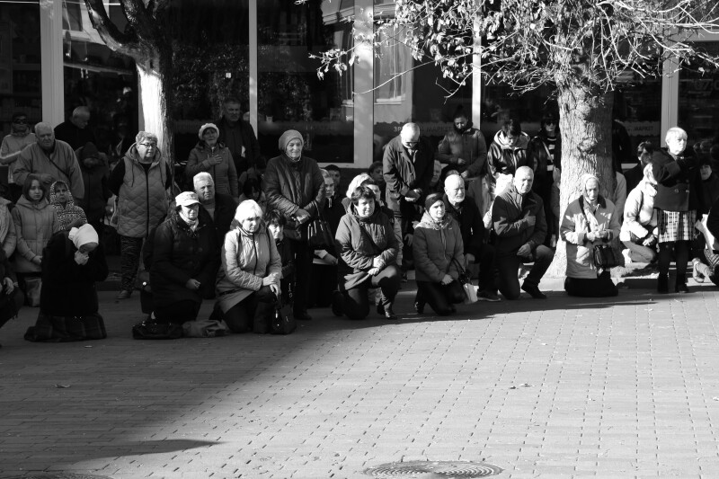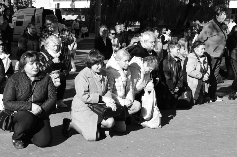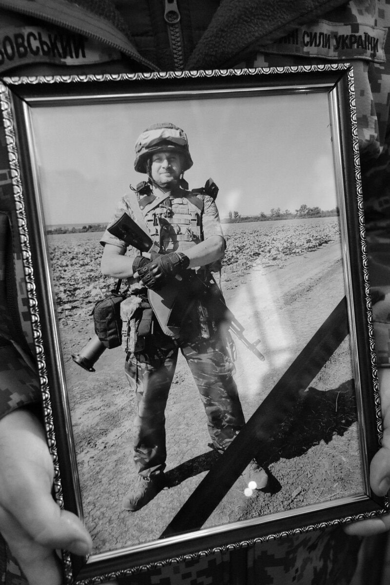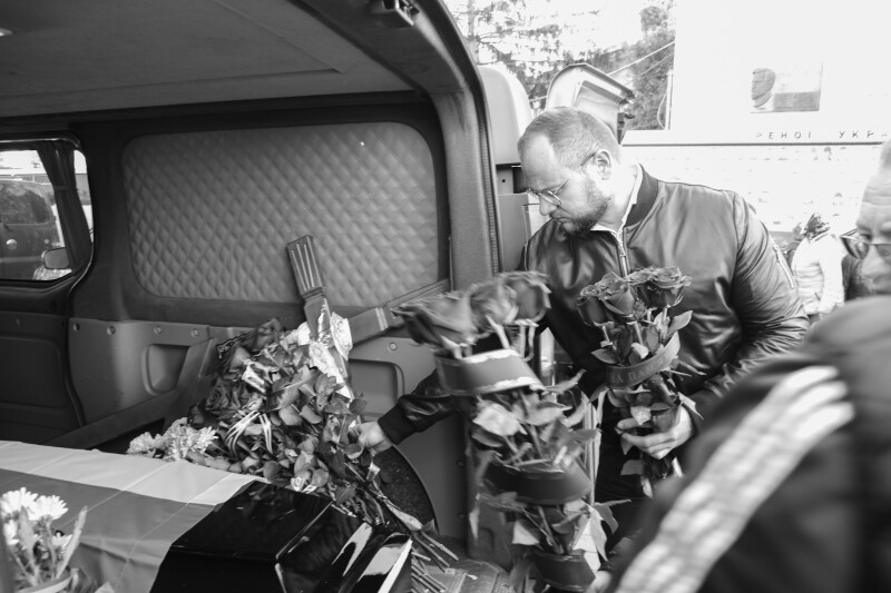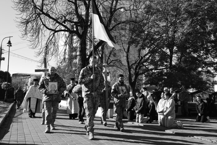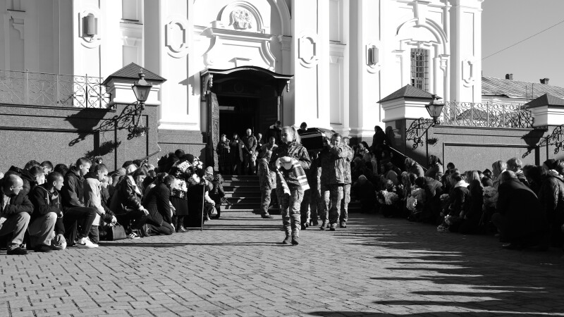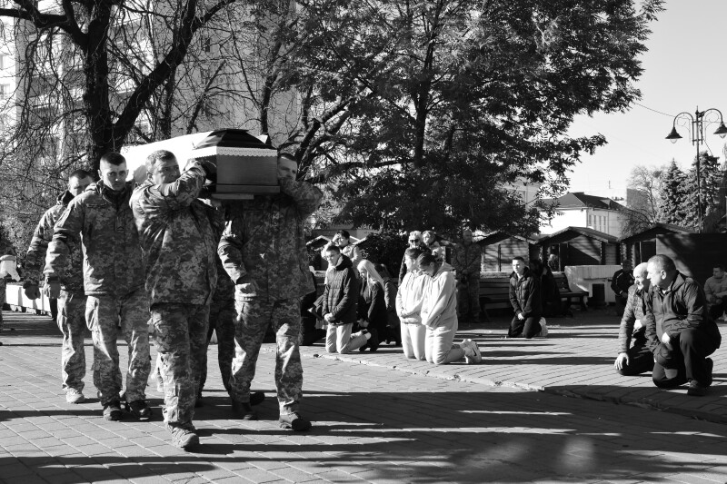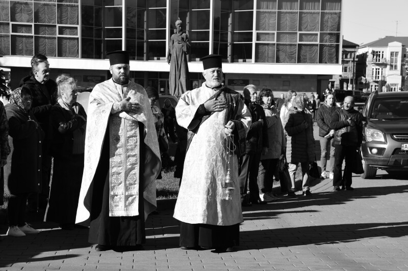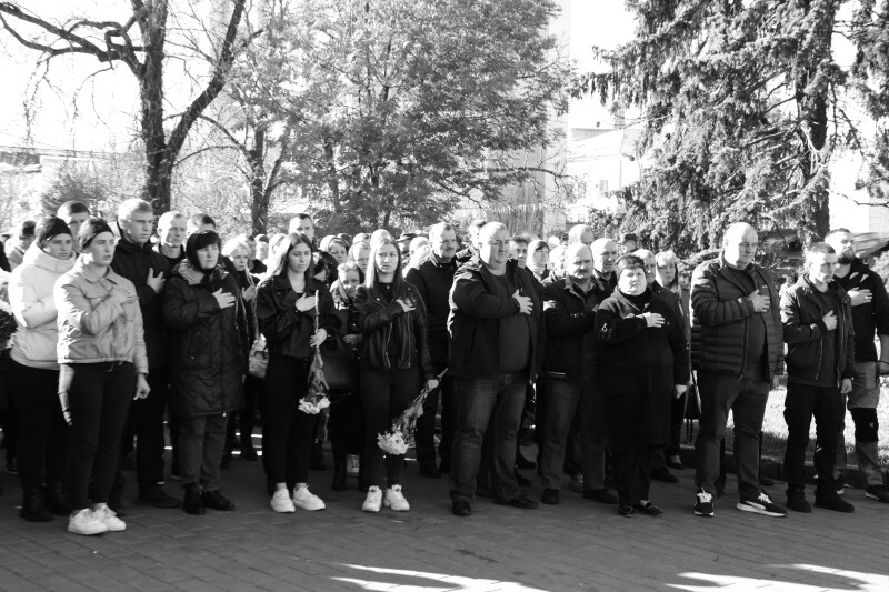 Після завершення панахиди домовини з тілами воїнів прощальною ходою пронесли Театральним майданом. Біля фотостенду “Герої Небесної Сотні – Загинули за єдність України” скорботна процесія зупинилася і виконала Державний Гімн.