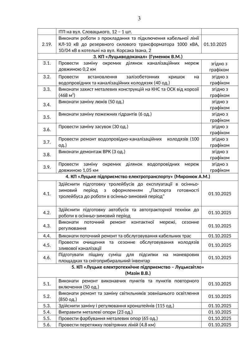 Йдеться про ремонти під’їздів, теплових мереж, мереж водопостачання та водовідведення, ремонт та заміна світильників зовнішнього освітлення, підготовка тролейбусів до експлуатації в осінньо-зимовий період, заміна насосного обладнання, підготовка до опалювального сезону індивідуальних теплових пунктів в житлових будинках та інші роботи.