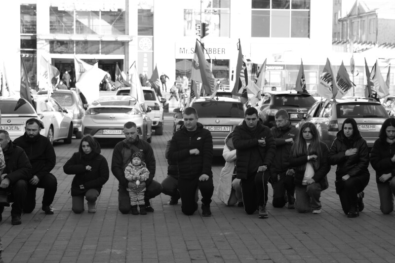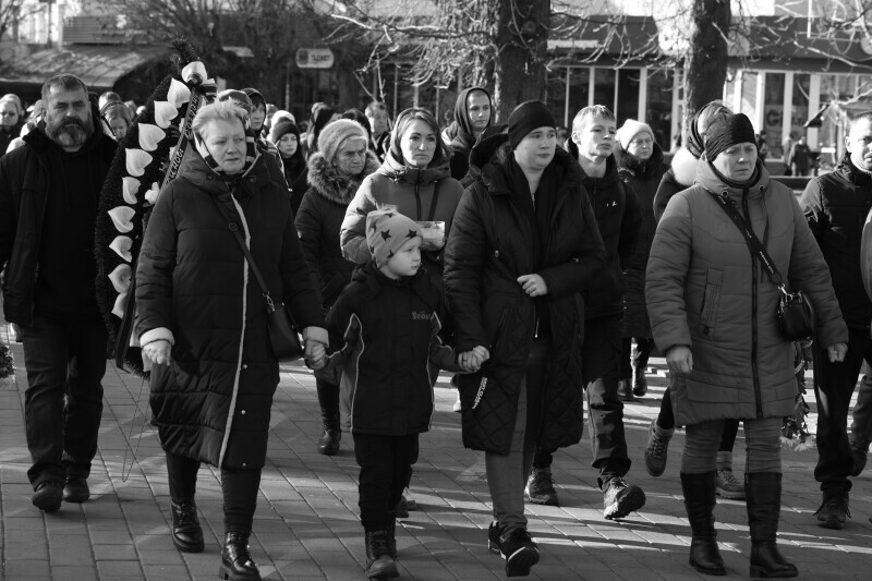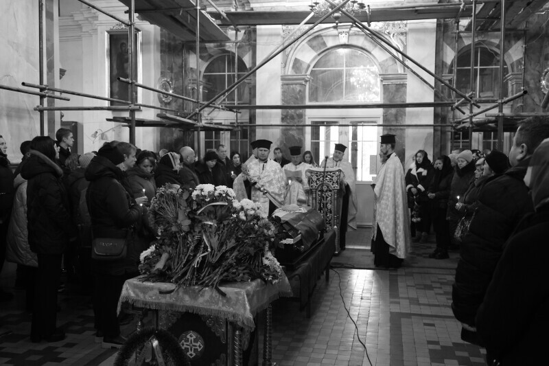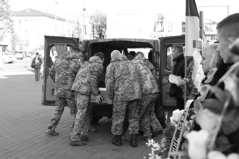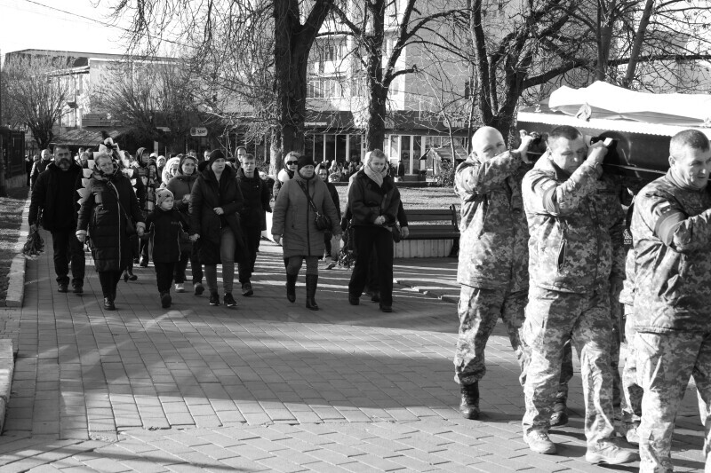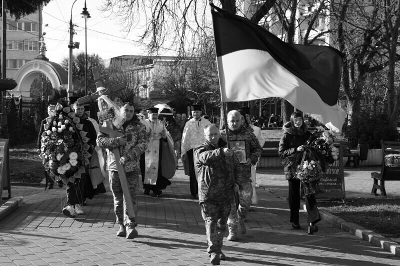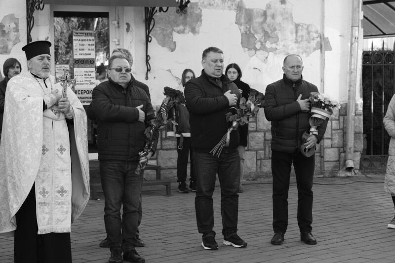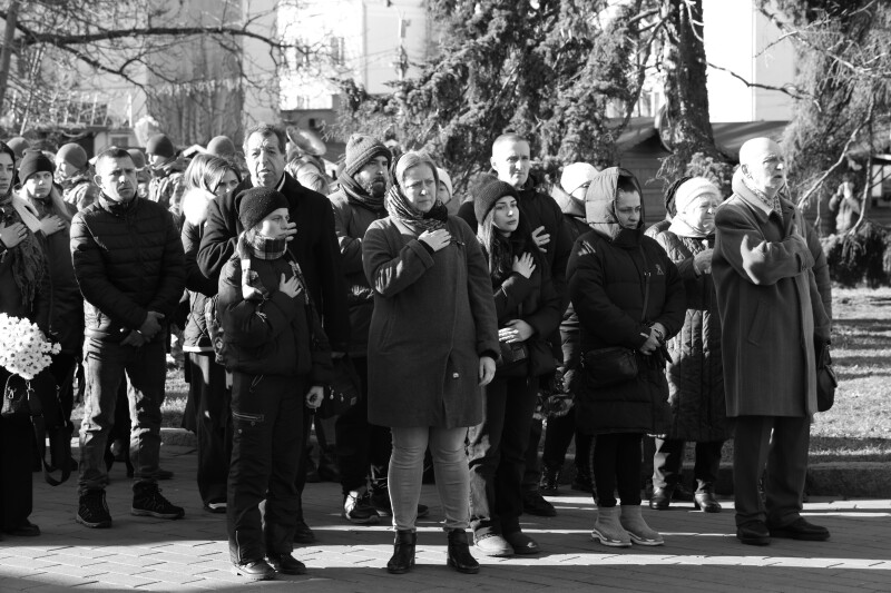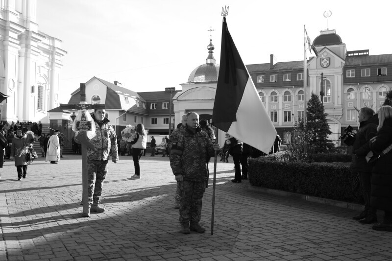 Після завершення богослужіння труну з тілом покійного захисника пронесли Театральним майданом. Біля пам’ятного фотостенда загиблим Героям присутні зупинилися і виконали Державний Гімн України.